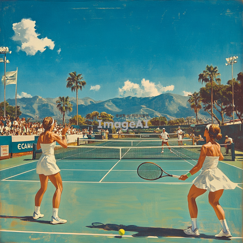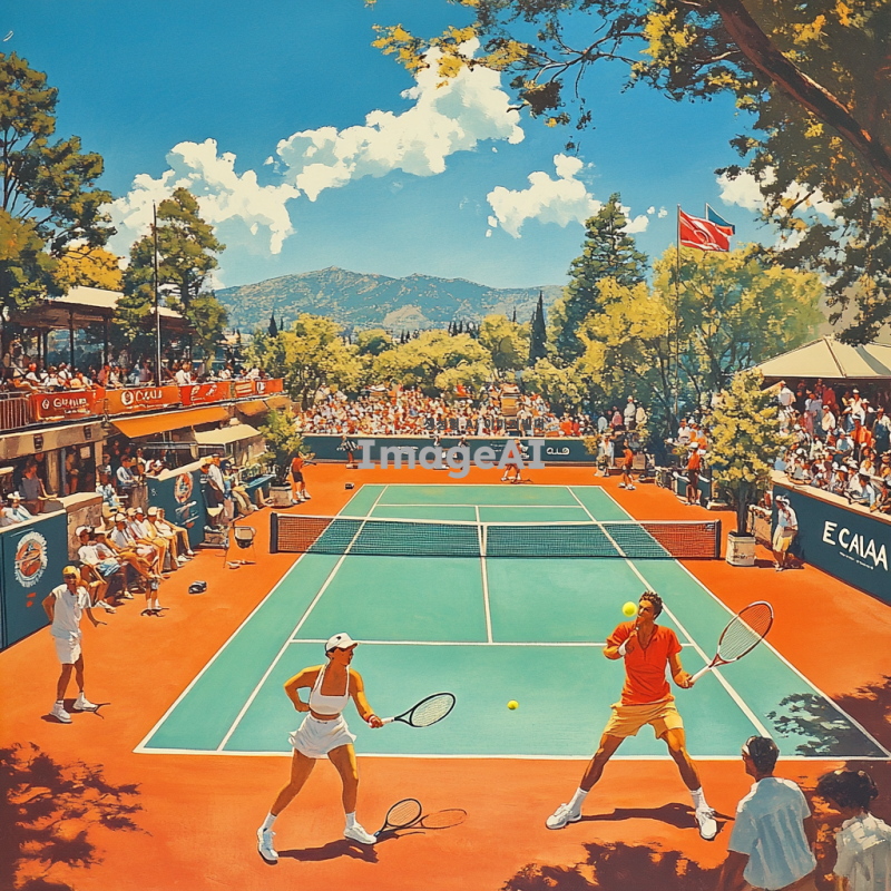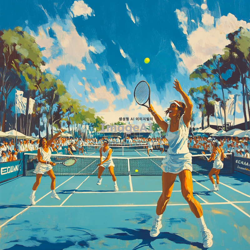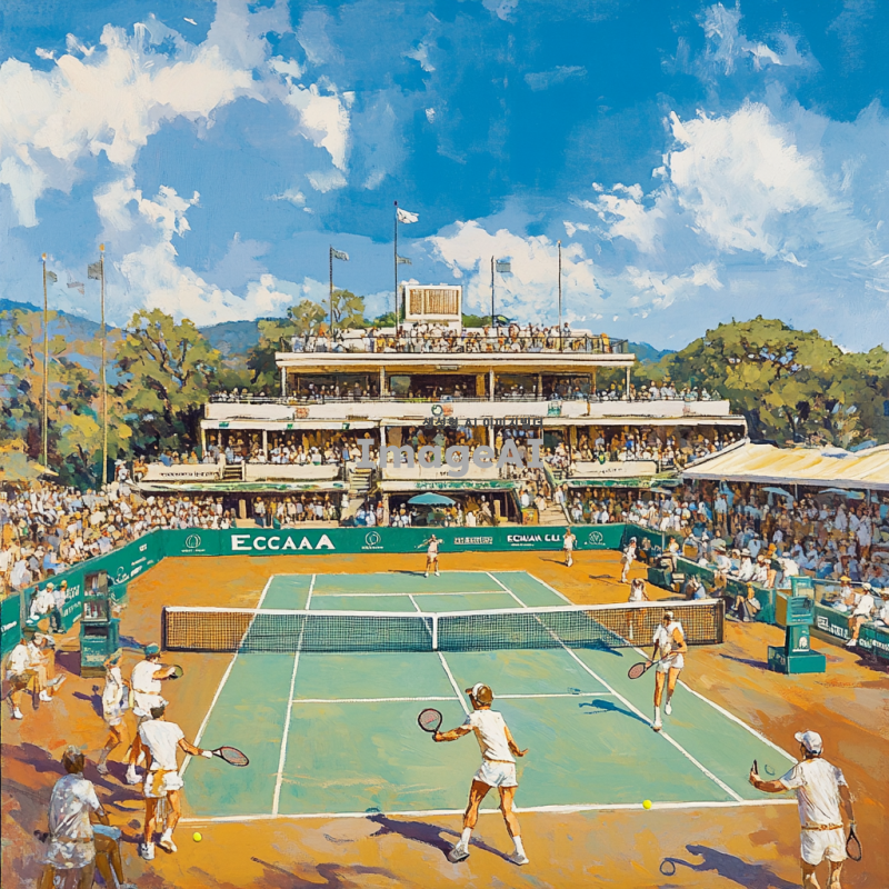 ECANA CLUB 테니스 코트를 배경으로 한 활기찬 테니스 경기 장면, 푸른 하늘 아래에서 테니스를 즐기는 사람들, 선수들이 역동적인 자세로 공을 치고 있는 모습, 코트 주변에는 관중들이 응원하고 있는 모습, 테니스 라켓과 공이 강조된 장면, 선수들의 표정은 집중하면서도 즐거운 느낌, 코트 주변에는 ECANA CLUB의 로고가 보이는 배너나 깃발이 배치된 모습, 전체적으로 밝고 생동감 있는 색감.