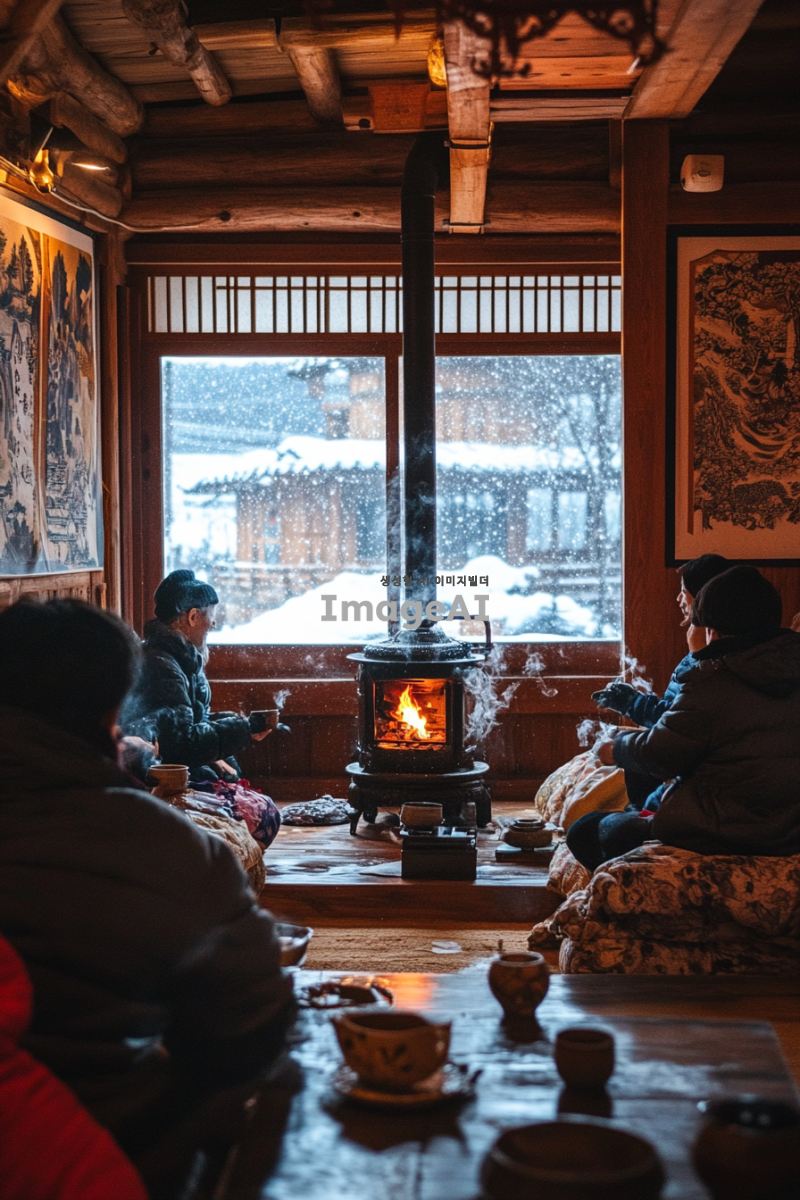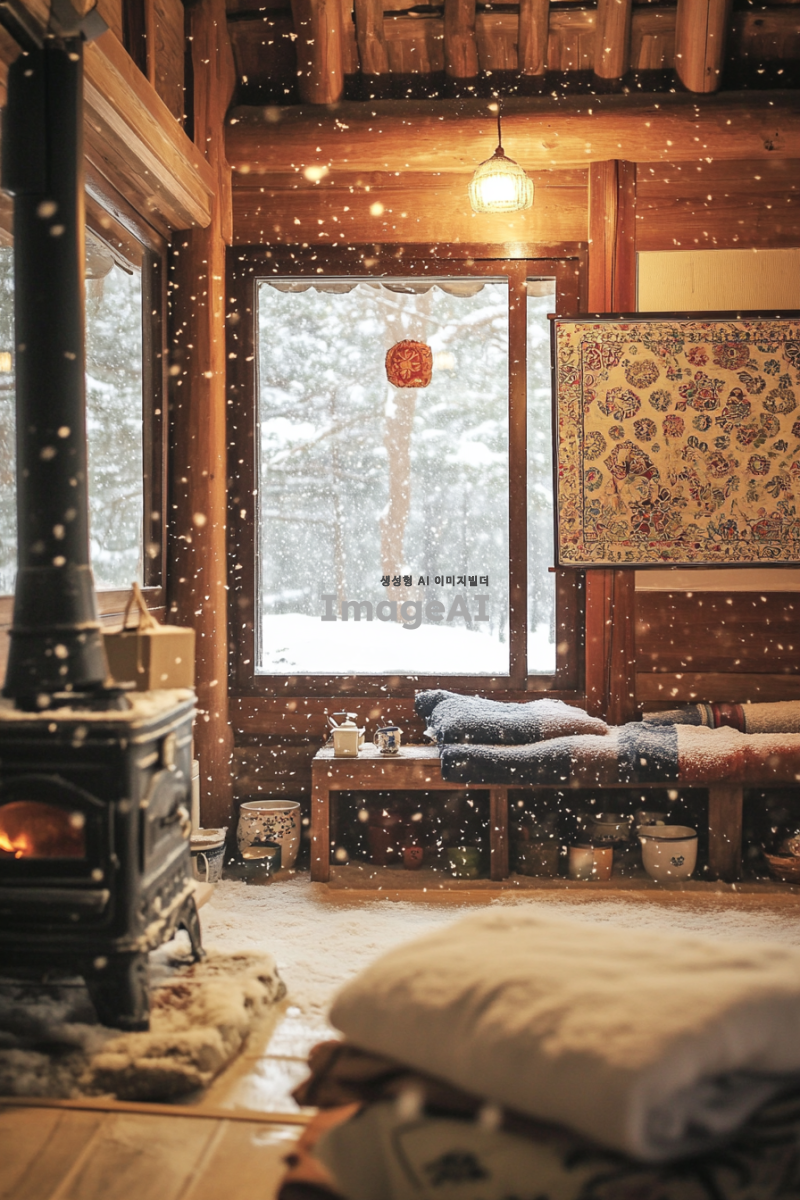 따뜻한 겨울철 분위기의 한국 전통 온돌방, 창밖에는 눈이 내리고 있고 방 안에는 아늑한 조명 아래에서 따뜻한 차를 즐기는 사람, 방 안에는 전통적인 한국식 난로와 두꺼운 담요가 놓여 있으며, 벽에는 한국 전통 문양이 장식된 그림이 걸려 있는 장면, 포근하고 편안한 느낌을 강조