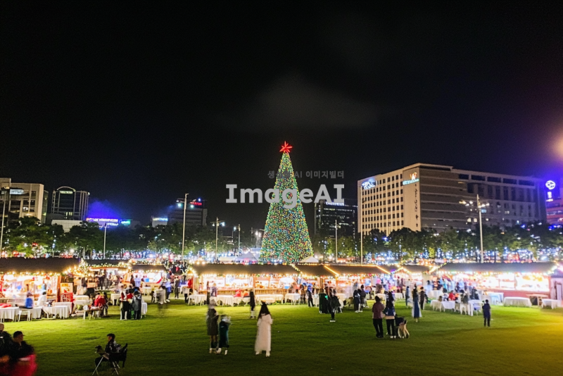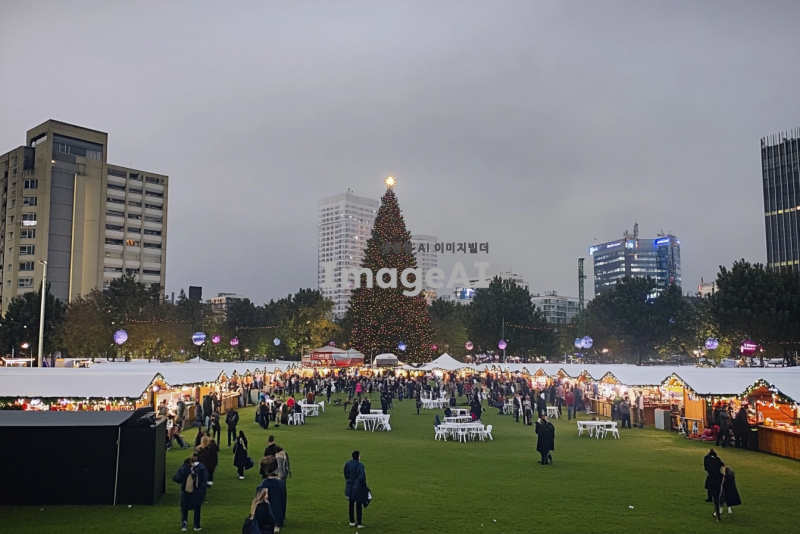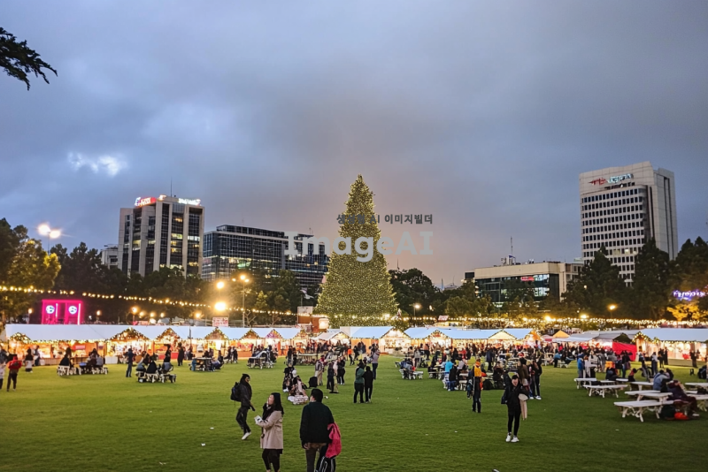 넓은 잔디 공원에 광범위 하게 크리스마스 마켓 초대형 행사가 진행중인것처럼 바꿔줘. 중앙엔 초대형 크리스마스 트리도 있고, 야외에는 화려한 알전구 조명들로 수놓아져 있고, 하얀색으로 된 크리스마스 마켓 길거리 노점들도 빼곡하게 일렬로 들어서 있고, 행사장 중앙엔 수천명의 사람들이 동시에 음식을 먹을 수 있는 테이블들이 있고, 축제를 즐기는 사람들로 발 디딜틈 없이 빼곡하게 가득차 있고.
