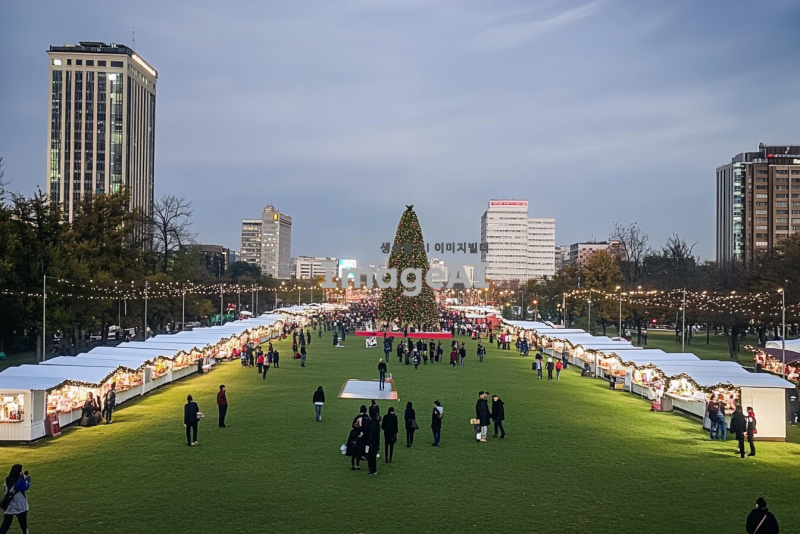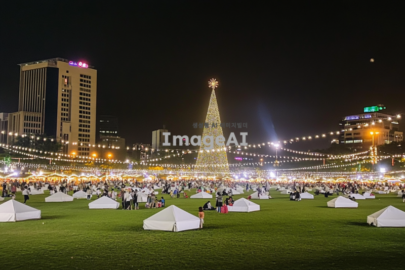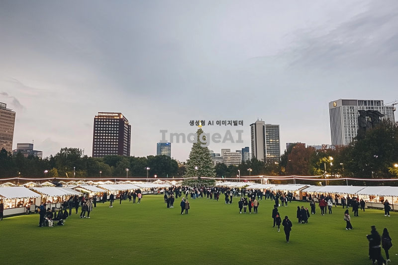 넓은 잔디 공원에 광범위 하게 10만명 정도 동시 수용가능한, 크리스마스 마켓 초대형 행사가 진행중인것처럼 바꿔줘. 중앙엔 초대형 크리스마스 트리도 있고, 야외에는 화려한 알전구 조명들로 수놓아져 있고, 하얀색으로 된 크리스마스 마켓 길거리 노점들도 빼곡하게 일렬로 들어서 있고, 축제를 즐기는 사람들로 발 디딜틈 없이 빼곡하게 가득차 있고.