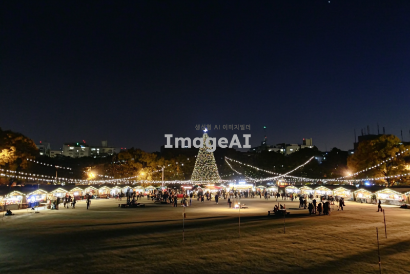 이 장소를 10만명 동시 참여 가능한 크리스마스 마켓 초대형 행사장으로 바꿔줘. 시간은 조명이 잘 보이는 한밤중으로. 행사장 가운데에는 초대형 크리스마스 트리가 있고, 행사장에는 하얀색으로 된 크리스마스 느낌 물씬나는 길거리 음식 노점들로 빼곡히 가득 차 있고, 알전구로 빼곡하고 화려하게 장식되어 있고, 축제를 즐기는 사람들로 발 디딜틈없이 빼곡히 가득차 있고.