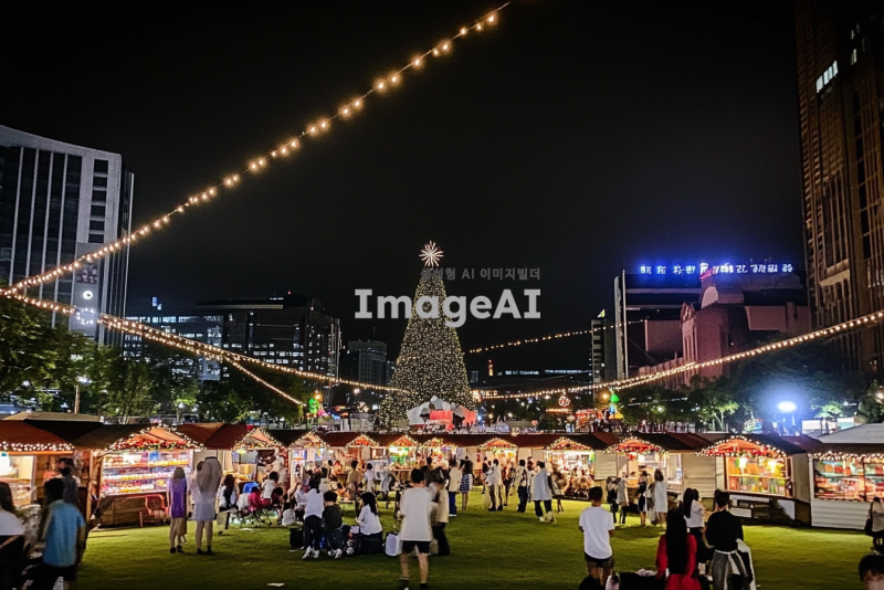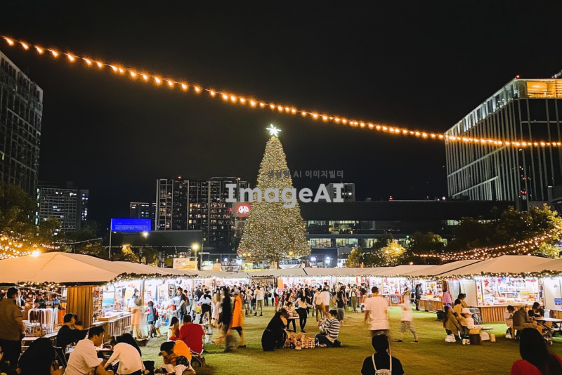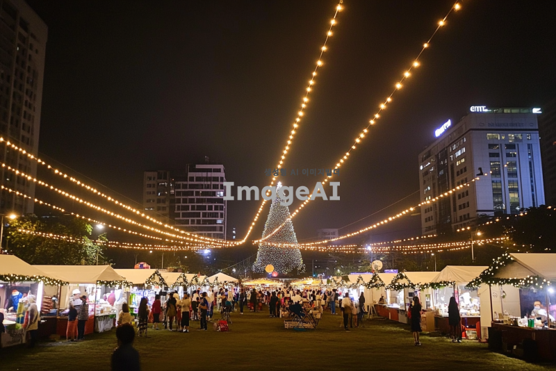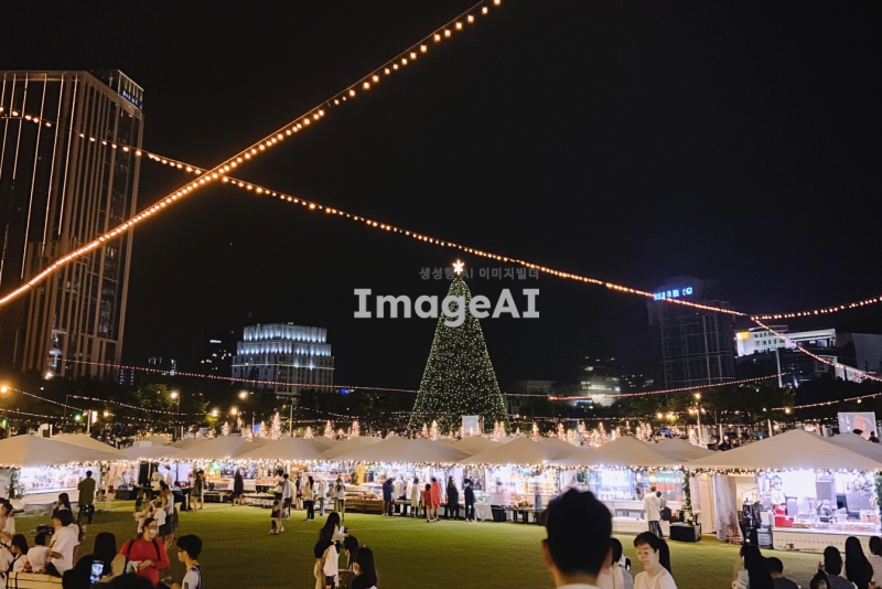 이 장소를 크리스마스 마켓 초대형 축제 행사장으로 바꿔줘. 행사장 가운데에는 초대형 크리스마스 트리가 있고, 행사장에는 하얀색으로 된 크리스마스 느낌 물씬나는 길거리 음식 노점들로 일렬로 쭉 늘어서 있고, 행사장은 알전구 조명들로 화려하게 장식되어 있고, 축제를 즐기는 사람들로 발 디딜틈없이 빼곡히 가득차 있고.