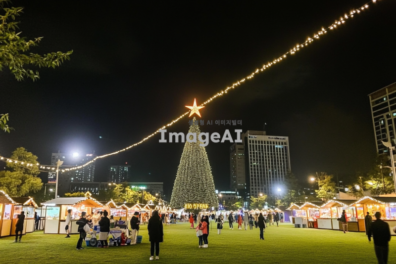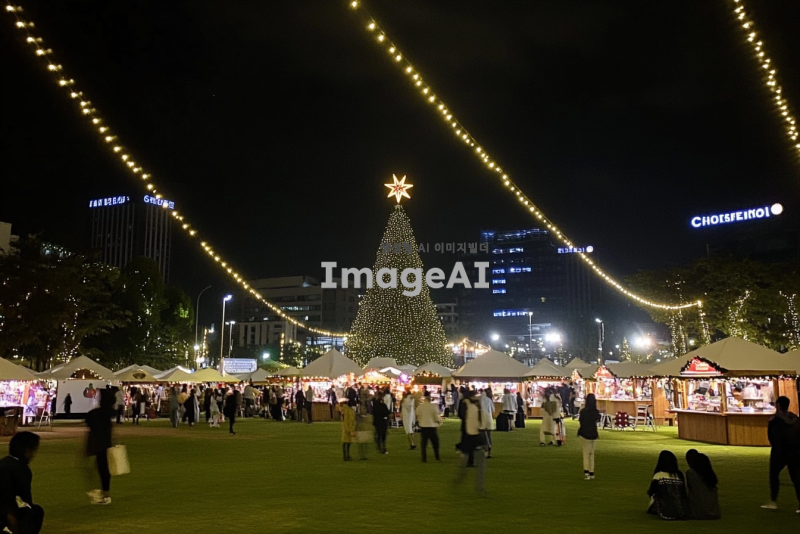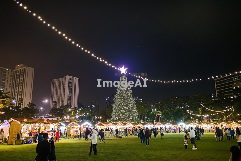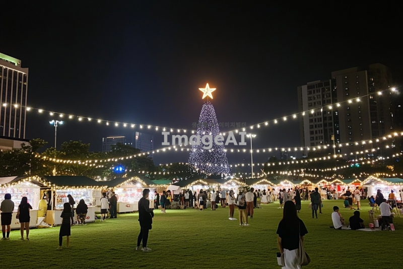 이 잔디공원을 넓고 광범위한 크리스마스 마켓 초대형 축제 행사장으로 바꿔줘. 행사장 가운데에는 초대형 크리스마스 트리가 있고, 트리 위에는 별모양 장식이 되어있고, 행사장에는 하얀색으로 된 크리스마스 느낌 물씬나는 길거리 음식 노점들로 행사장을 꽉 채우고 있고, 행사장은 수 많은 알전구 조명들로 빼곡하고 화려하게 장식되어 있고, 축제를 즐기는 사람들로 발 디딜틈없이 빼곡히 가득차 있고.