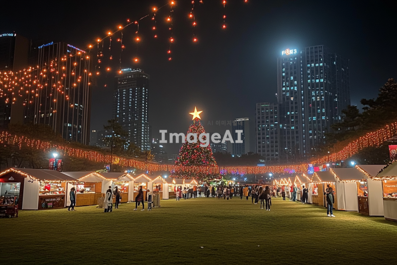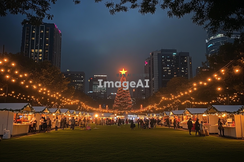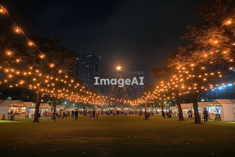 이 잔디공원을 넓고 광범위한 크리스마스 마켓 초대형 축제 행사장으로 바꿔줘. 행사장 가운데에는 초대형 크리스마스 트리가 있고, 트리 위에는 별모양 장식이 되어있고, 행사장에는 하얀색부스로 된 크리스마스 느낌 물씬나는 길거리 음식 노점들로 행사장을 일렬로 가득 채우고 있고, 행사장은 수 많은 알전구 조명이 주렁주렁 화려하고 빼곡하게 달려있고, 축제를 즐기는 사람들로 발 디딜틈없이 빼곡히 가득차 있고.