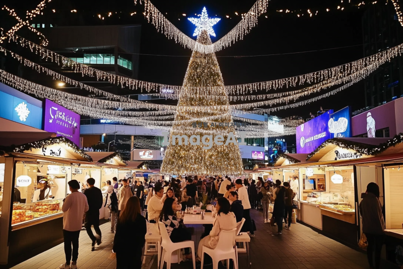 이 장소를 크리스마스 마켓 초대형 축제 행사장으로 바꿔줘. 행사장 가운데에는 초대형 크리스마스 트리가 있고, 행사장에는 하얀색으로 된 크리스마스 느낌 물씬나는 길거리 음식 노점들로 일렬로 쭉 늘어서 있고, 행사장은 알전구 조명들로 화려하게 장식되어 있고, 축제를 즐기는 사람들로 발 디딜틈없이 빼곡히 가득차 있고.