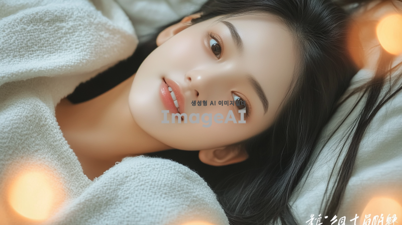 잠들기 전 부드러운 흰색 이불 위에 편안하게 누워있는 동양 여성, 그녀의 얼굴은 평화롭고 만족스러운 미소를 띠고 있으며, 긴 머리카락은 자연스럽게 흩어져 있다. 방 안은 따뜻한 색감의 조명으로 포근한 분위기를 자아낸다.