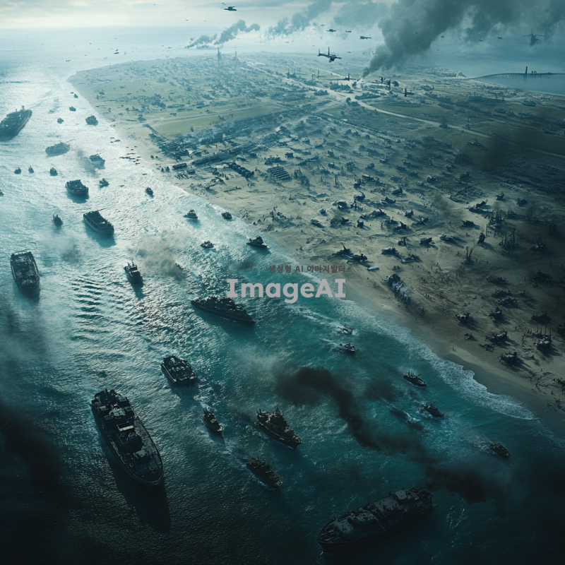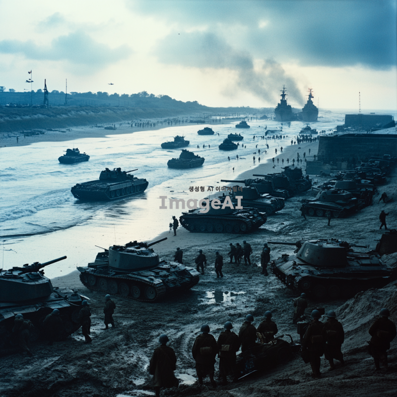 세계2차대전 노르망디상륙 작전 배경으로, 미군이 노르망디 만에 상률하는 장면, 독일군인 이를 저지하는 장면, 독일군 탱크 다수, 미군은 항공모함 다수