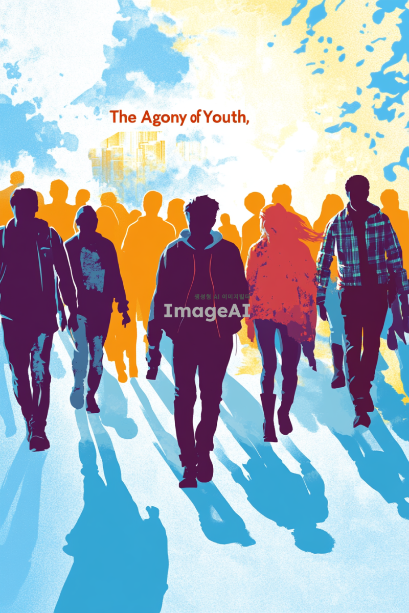 청년 실업과 은둔 청년 문제가 심각해지고 있어 이에 대해 경제적인 영향을 알고 싶어 탐구하였다-> 청년 은둔의 사회적 비용 분석, 청년 구직 활동 지원금의 정책 효과 분석, 청년 취업을 증가시키기 위한 방안 제언과 관련된 책을 쓰려고 하는데 이 책의 이름은 청춘의 고뇌고 이 책의 표지를 만들어 줄 수 있니? 책의 주제가 좀 어둡지만 책의 표지는 어둡지 않았으면 해