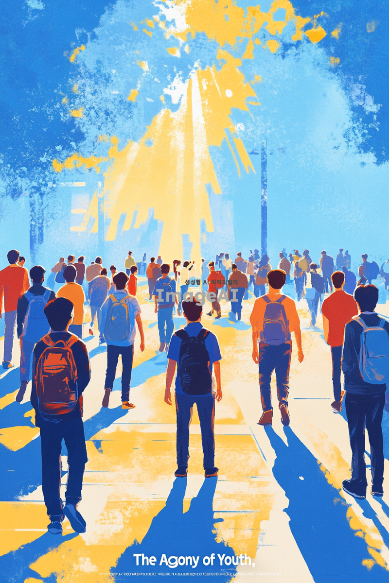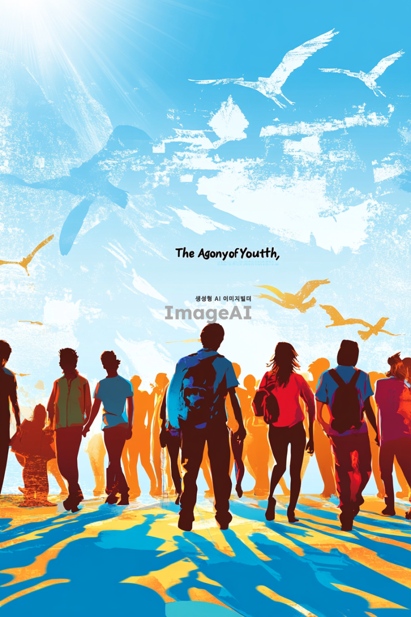 청춘의 고뇌라는 제목의 책 표지 디자인, 청년 실업과 은둔 청년 문제를 다루는 경제적 사회적 분석을 주제로 함. 표지는 밝고 희망적인 느낌을 주며, 청년들이 서로 협력하고 함께 나아가는 모습을 상징적으로 표현. 배경은 푸른 하늘과 밝은 햇살, 미래를 향해 걷는 청년들의 실루엣을 포함. 다양한 색상의 옷을 입은 청년들이 함께 모여 있는 모습, 희망과 가능성을 상징하는 요소들로 구성. 책 제목은 중앙에 배치하고, 서체는 현대적이고 세련된 느낌으로 선택.