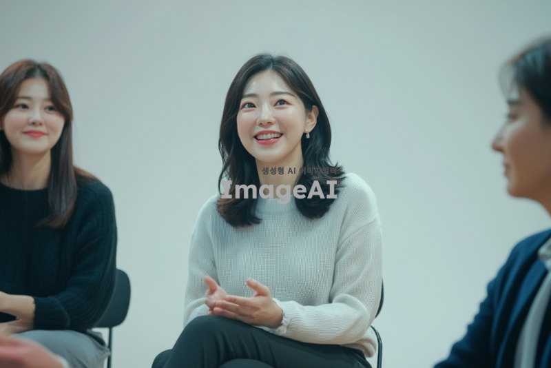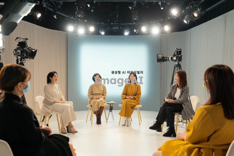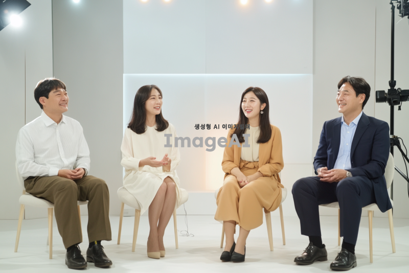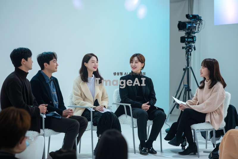 밝고 현대적인 토크쇼 세트, 다양한 연령대의 한국인 출연자들이 편안하게 앉아 있는 모습, 출연자들은 활발하게 대화 중이며 웃고 있는 표정, 세련된 의상을 입고 있으며 배경은 깔끔한 흰색으로 설정, 무대 조명은 부드럽고 따뜻한 분위기를 연출, 토크쇼의 활기찬 분위기를 잘 표현