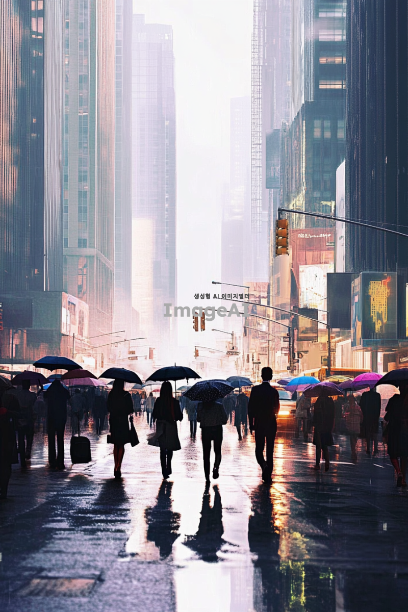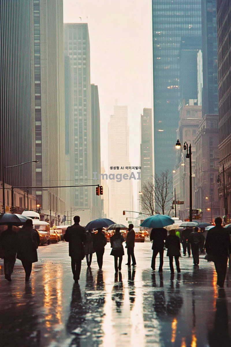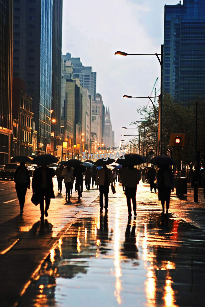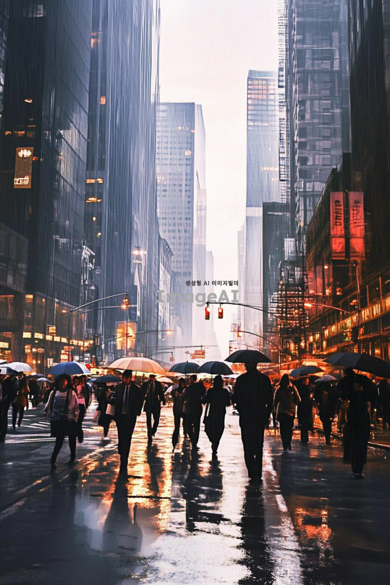 쓸쓸한 도시 배경, 흐린 날씨, 회색과 파란색 톤, 거리에는 우산을 든 사람들이 드문드문 걷고 있음, 사람들은 주로 비즈니스 캐주얼 복장, 도로에는 빗물이 고여 있고 반사된 도시의 불빛이 보임, 건물들은 현대적이고 고층, 거리의 가로등이 희미하게 빛나고 있는 모습, 전체적으로 고독하고 차분한 분위기.