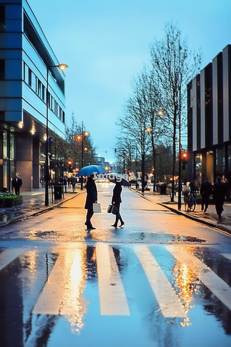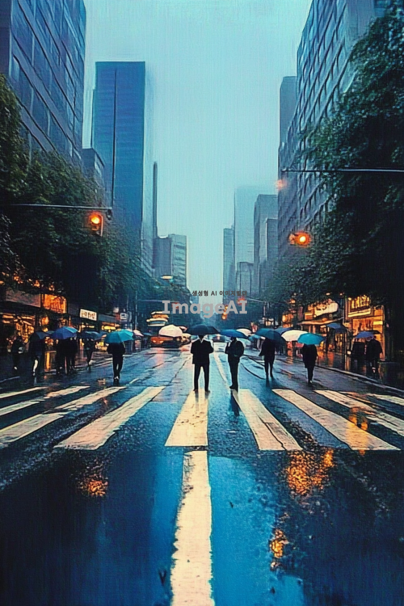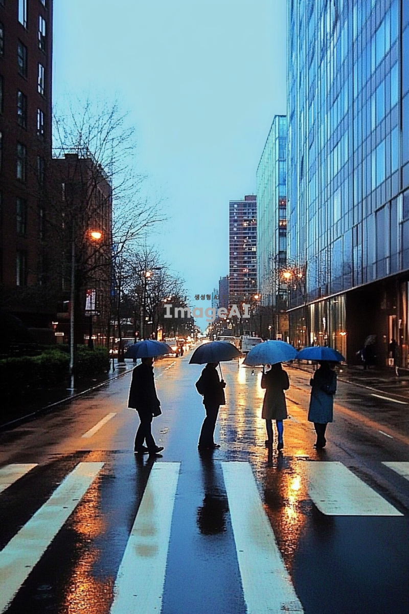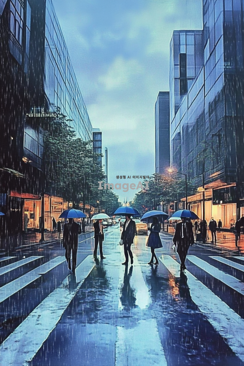 쓸쓸한 도시 배경, 흐린 날씨, 회색과 파란색 톤, 거리에는 우산을 든 사람들이 드문드문 걷고 있음, 사람들은 주로 비즈니스 캐주얼 복장, 도로에는 빗물이 고여 있고 반사된 도시의 불빛이 보임, 건물들은 현대적이고 골목길, 거리의 가로등이 희미하게 빛나고 있는 모습, 전체적으로 고독하고 차분한 분위기.