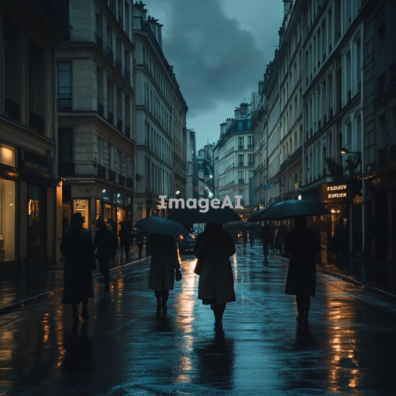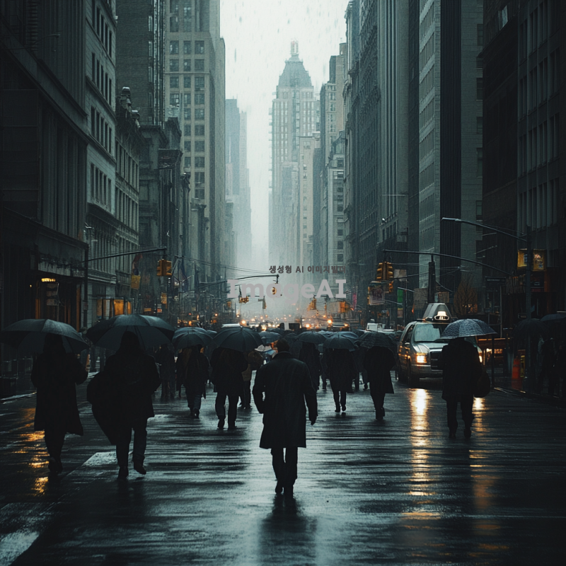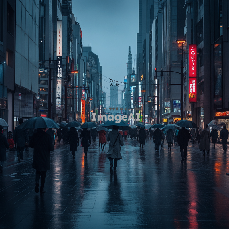 쓸쓸한 도시 배경, 흐린 날씨, 회색빛 건물들이 벽처럼 줄지어 서있는 거리, 가로등이 켜진 저녁 시간, 많은 사람들이 코트를 입고 우산을 들고 걸어가는 모습, 바쁜 일상 속 무표정한 얼굴, 도시의 소음이 느껴지는 배경, 조용히 걷는 사람들, 차가운 바람이 불어오는 거리, 도시의 쓸쓸한 분위기 강조, 아이레벨 샷 규도.