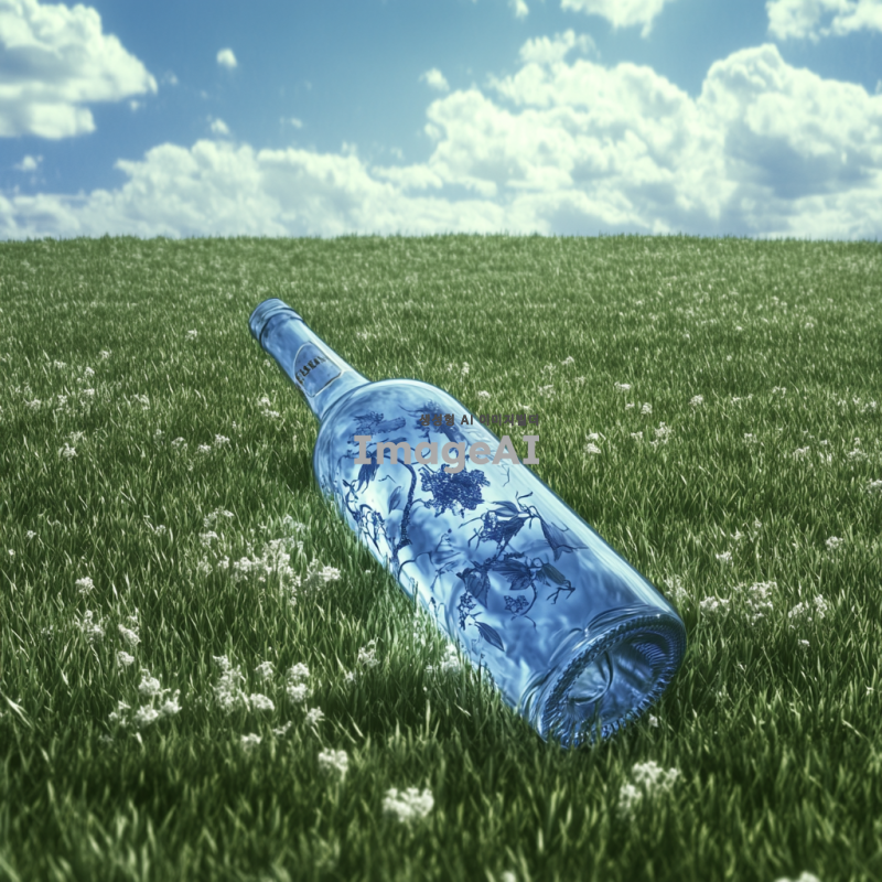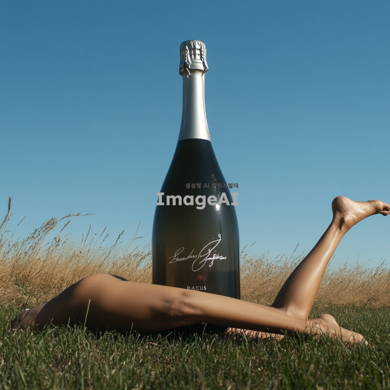 푸른 하늘 아래 초원 위를 달리는 다리 달린 박카스 병, 에너지 넘치는 역동적인 포즈, 병의 라벨이 선명하게 보이도록, 생동감 있는 움직임 강조, 바람에 흔들리는 풀과 함께 자연스러운 배경.