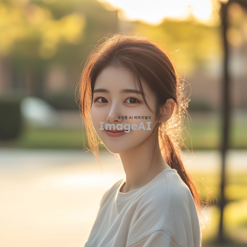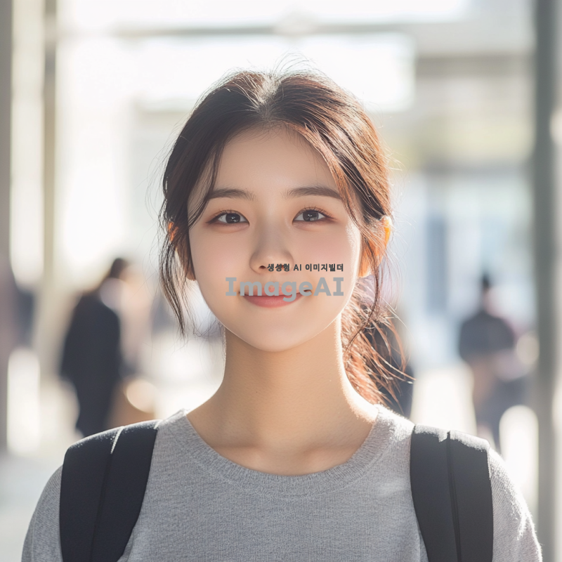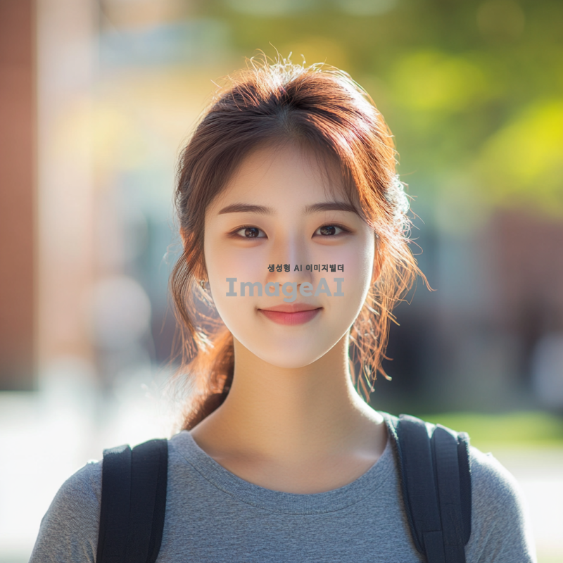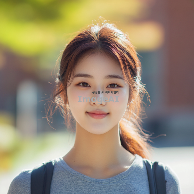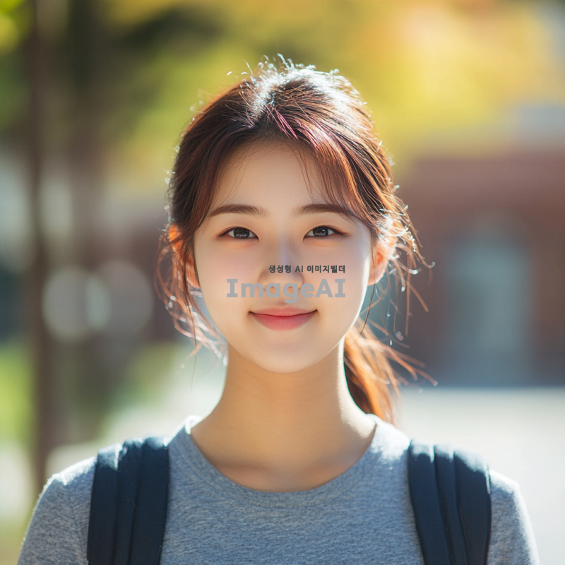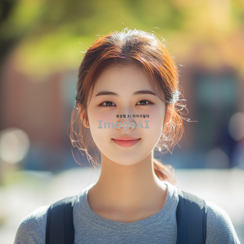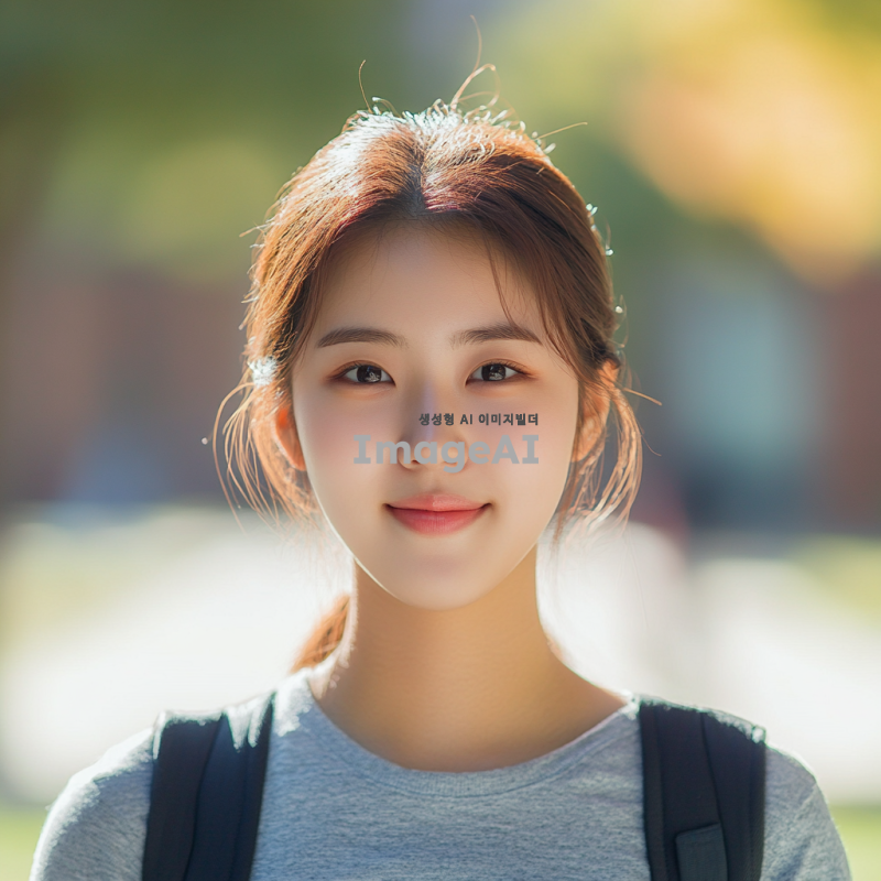 20대 한국인 여학생, 머리를 단정하게 묶고, 캐주얼한 옷차림, 밝고 친근한 표정, 배경은 대학 캠퍼스, 자연광이 비치는 장면, 여유롭고 활기찬 분위기.