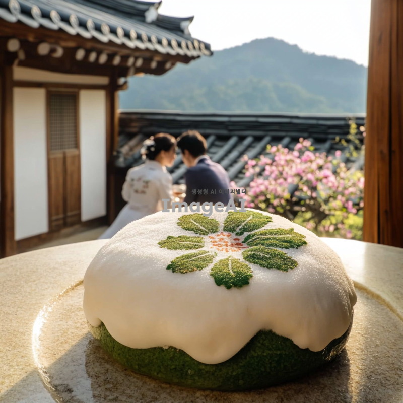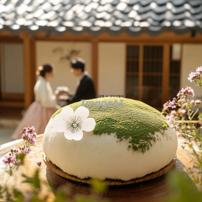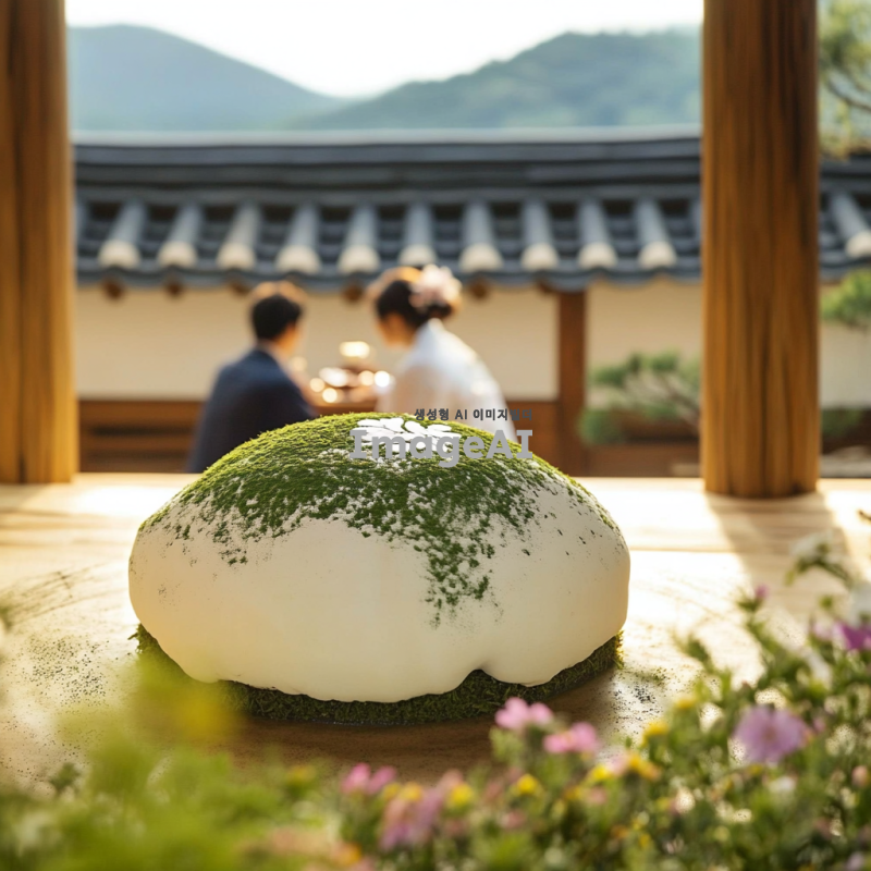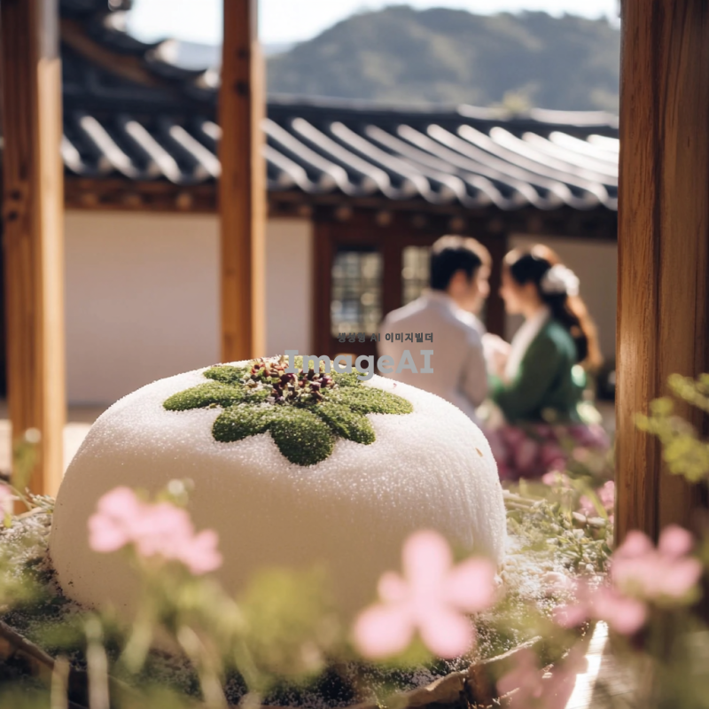 밝고 화사한 분위기의 한국 전통 한옥 마당, 햇살이 부드럽게 비치는 오후, 정교한 나무 기둥과 기와 지붕, 마당에는 다양한 색상의 꽃들이 만개해 있고, 한복을 입은 남녀가 다정하게 앉아 차를 마시는 모습, 배경에는 푸른 산과 맑은 하늘이 펼쳐져 있는 장면.