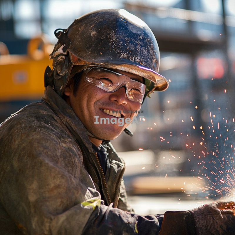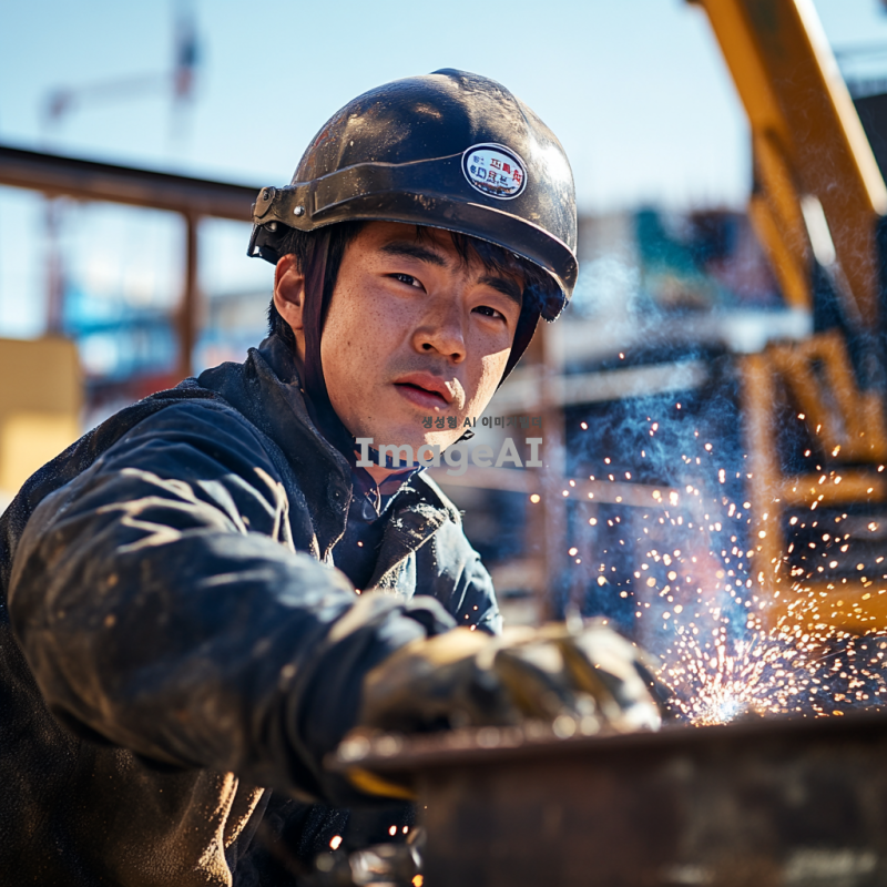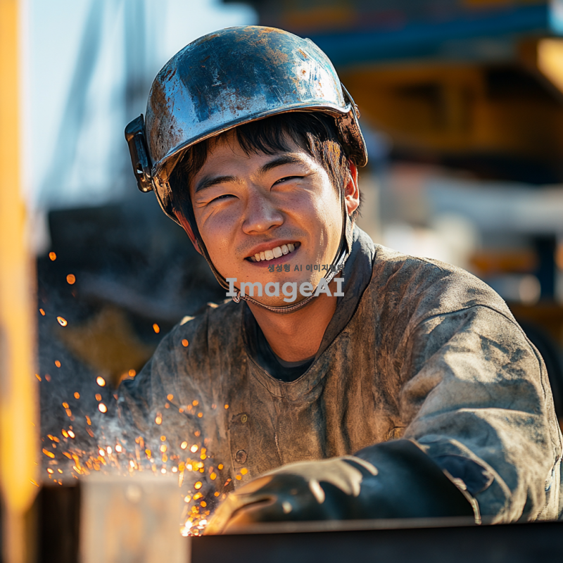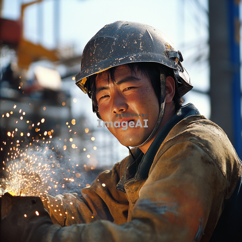 건설 현장에서 헬멧과 보호 장비를 착용한 한국인 용접기술자가 용접 작업을 하고 있는 모습. 얼굴에는 땀이 맺혀 있고, 보람찬 표정을 짓고 있다. 주변은 밝고 활기찬 분위기이며, 배경에는 건설 현장의 구조물과 장비들이 보인다. 용접기의 불꽃이 생생하게 표현되어 있으며, 작업의 집중감이 느껴진다.