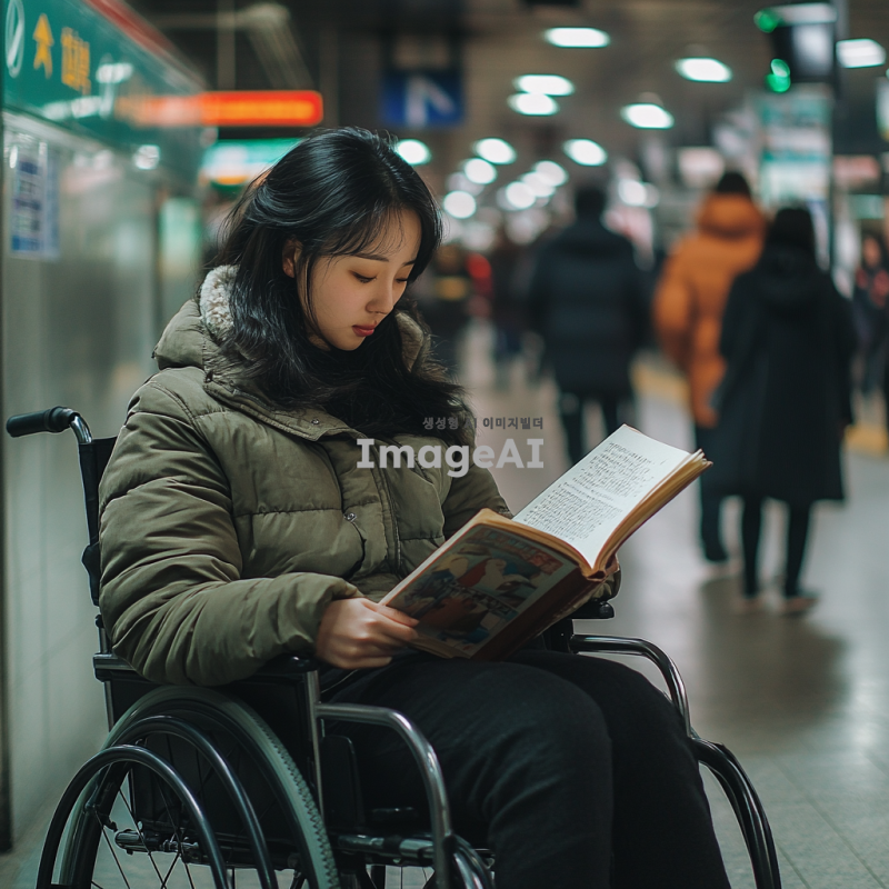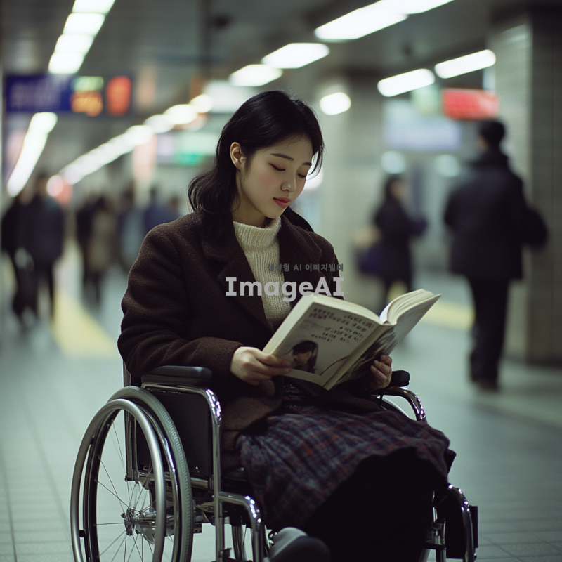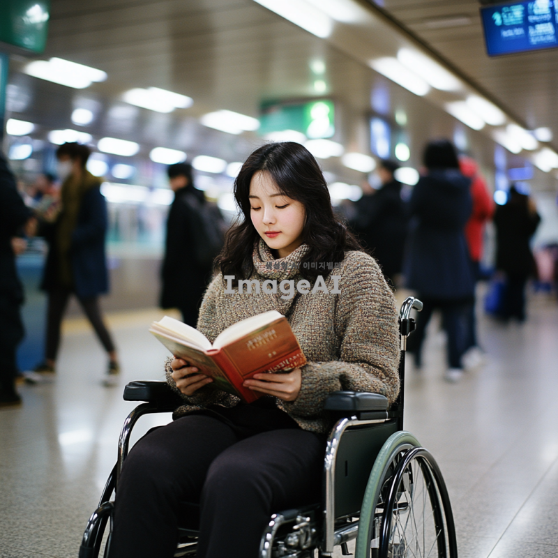 지하철 역 플랫폼에서 책을 읽고 있는 22세 한국인 여성, 휠체어에 앉아있으며 편안한 표정을 짓고 있음. 주변에는 바쁜 사람들로 가득 차 있지만, 그녀는 독서에 집중하고 있음. 그녀의 옷은 캐주얼하면서도 세련된 스타일이며, 책은 흥미로운 소설로 보임. 지하철 역의 배경은 현대적이고 깨끗한 느낌.