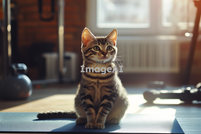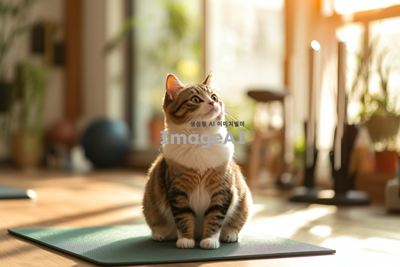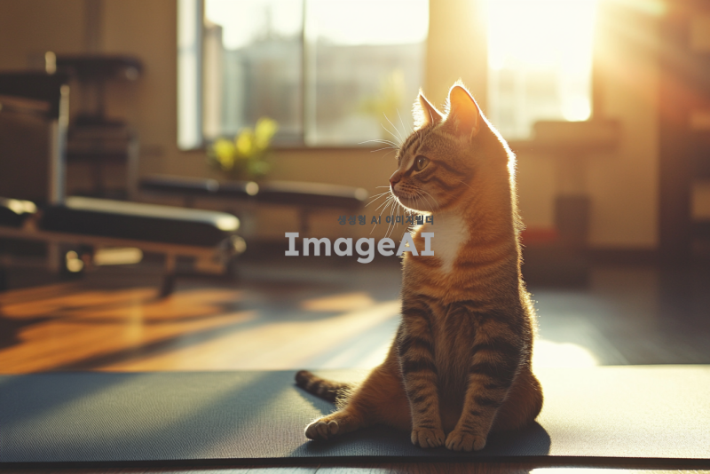 밝은 조명 아래에서 필라테스 매트 위에 앉아 있는 귀여운 고양이, 스트레칭 자세를 하고 있으며, 주변에 필라테스 도구들이 놓여져 있음. 고양이는 부드럽고 유연한 자세로 운동을 즐기고 있는 모습, 배경은 깔끔한 실내 필라테스 스튜디오, 창문으로 햇빛이 들어와 따뜻하고 편안한 분위기를 연출.