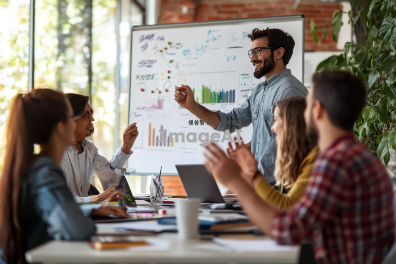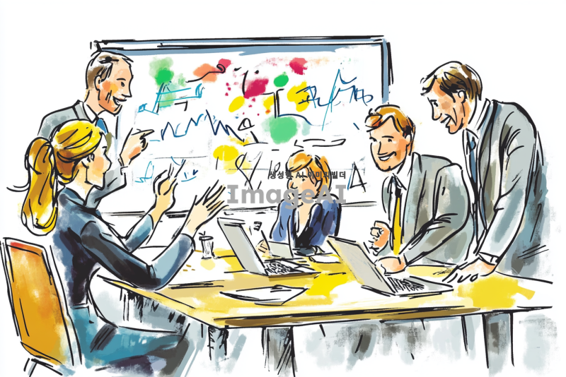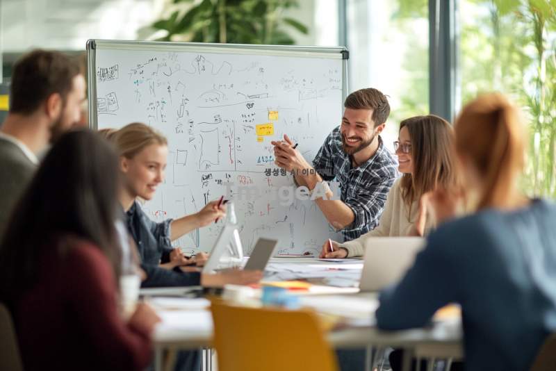 2. 해결하려는 문제: 팀원들이 협력하여 문제를 해결하는 과정. 여러 사람이 책상에 둘러앉아 노트북과 문서들을 활용하며, 서로의 의견을 조율하는 모습. 한 사람이 큰 플립차트에 해결 방안을 설명하고 있고, 다른 사람들은 메모를 하거나 질문을 던지고 있다.