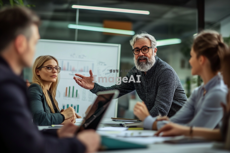 1. 문제 정의: 회의실에서 여러 사람이 모여 활발하게 토론하는 장면. 각자의 의견을 제시하며 큰 화이트보드에 다양한 아이디어가 적혀 있는 모습. 사람들은 진지한 표정으로 서로의 의견을 경청하며, 다양한 연령대와 성별의 사람들이 포함되어 있다.