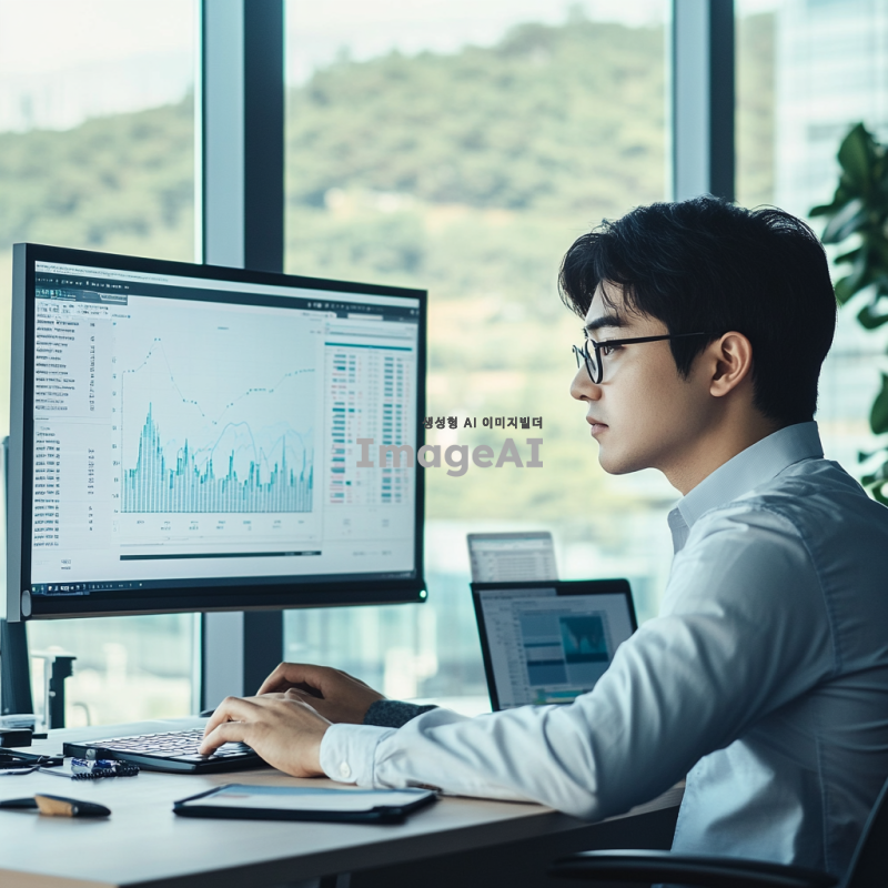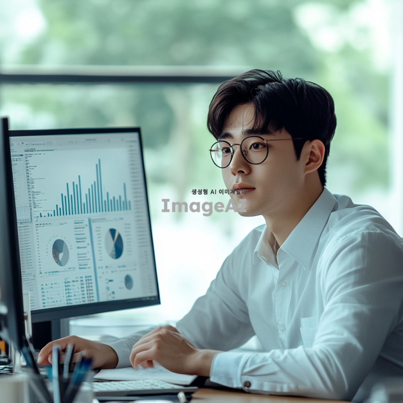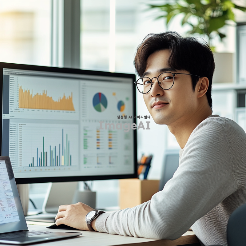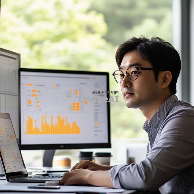 데이터 분석을 위해 컴퓨터 화면 앞에 앉아 있는 한국인 데이터 과학자, 주변에 그래프와 데이터 시각화가 모니터에 표시되어 있으며, 노트북과 여러 가지 데이터 분석 도구들이 책상 위에 놓여 있는 모습, 현대적이고 깔끔한 사무실 환경, 창문을 통해 자연광이 들어오는 장면, 집중하고 있는 표정의 데이터 과학자, 디지털과 아날로그가 조화된 작업 공간.