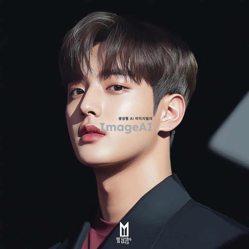 앞머리를 깐 짧은 검정 머리를 한 20대 한국인 남성이 검은색 정장을 입고 있는 모습, 세련된 분위기를 강조한 중간 거리에서의 초상화, 부드러운 조명 아래 현대적인 스타일로 표현, 무표정이며 잘생긴 얼굴, 스케치 스타일로 묘사.