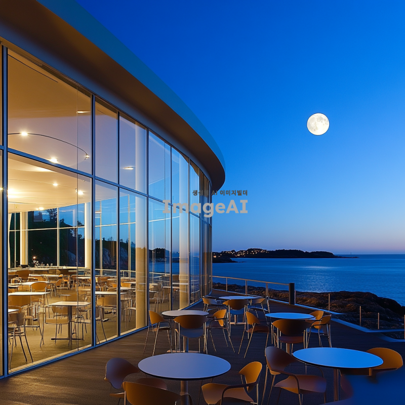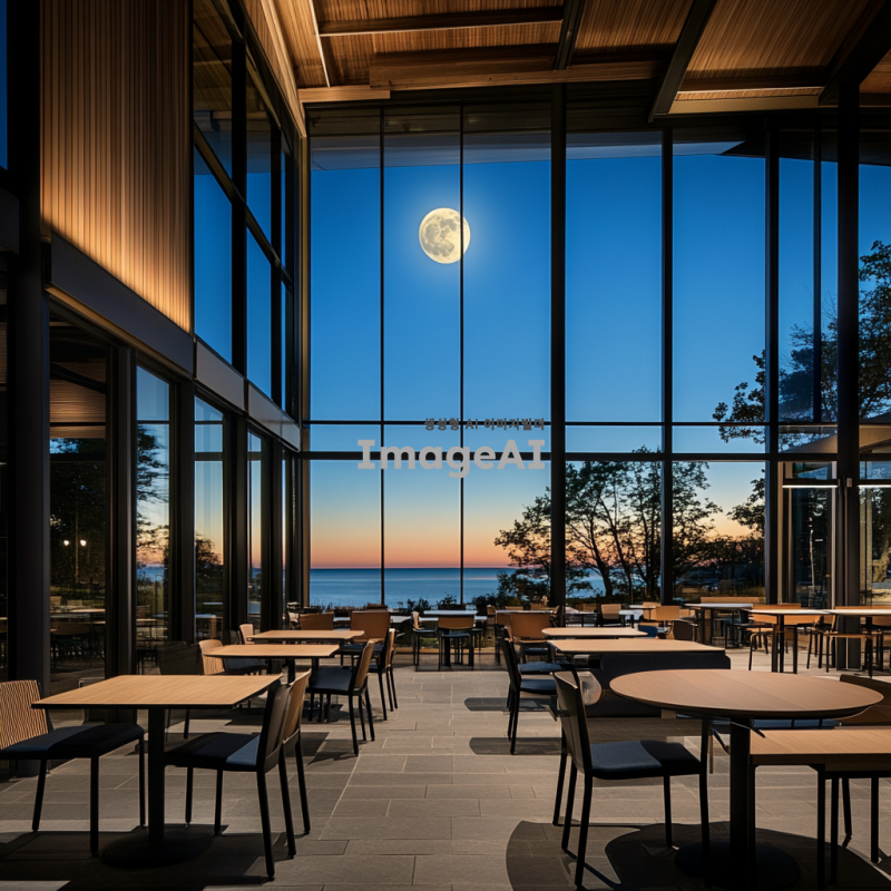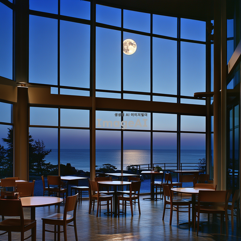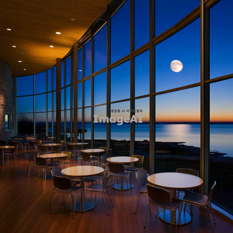 통유리 창문으로 벽이 되어 있는 급식실 내부, 창문 밖으로는 잔잔한 바다가 펼쳐져 있고, 하늘에는 밝은 달이 떠 있는 장면. 급식실 내부는 따뜻하고 아늑한 분위기로, 현대적인 디자인의 테이블과 의자가 배치되어 있으며, 창문을 통해 들어오는 달빛이 실내를 은은하게 비추고 있다.