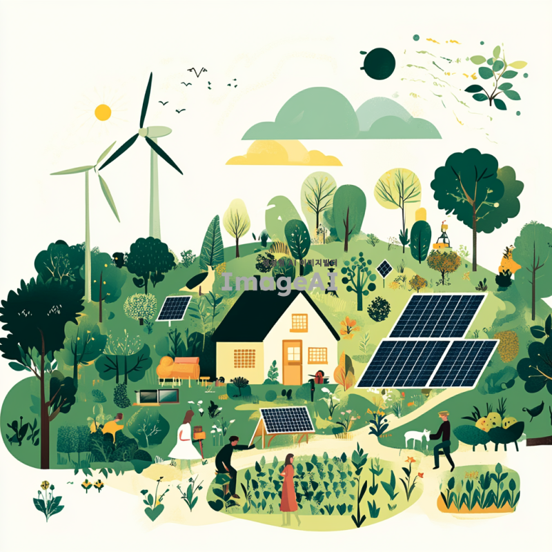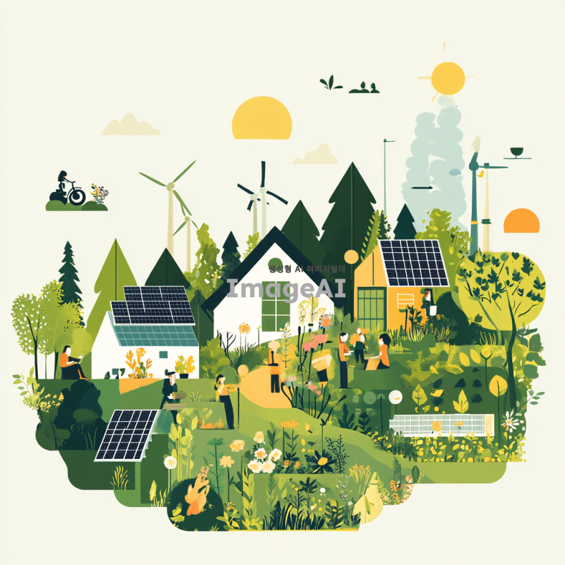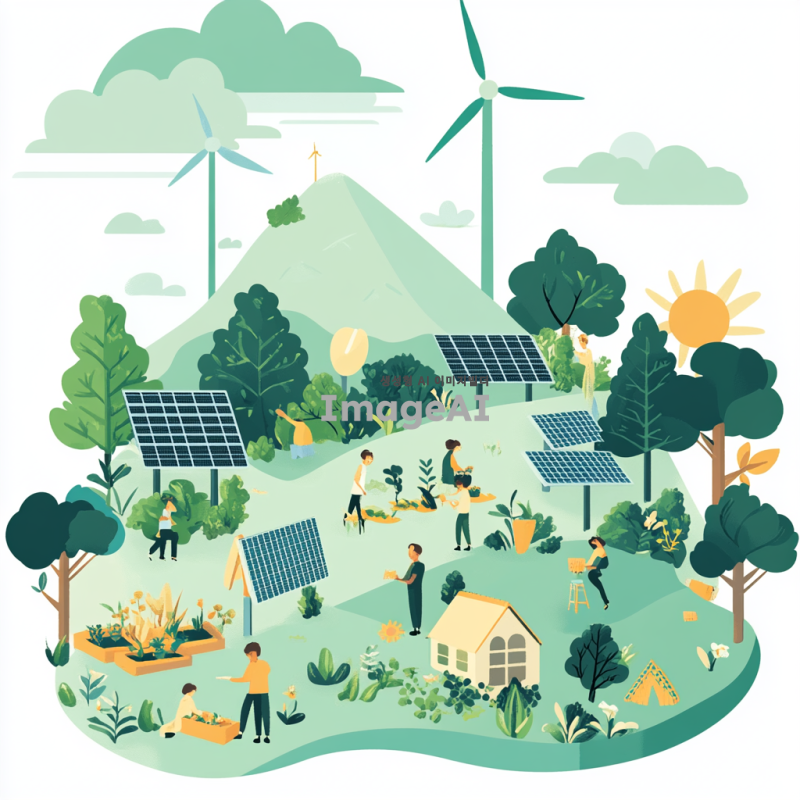 온에코의 사업목적인 제품력, 지속가능성, 친환경소비, 지역사회지원을 시각적으로 표현한 이미지. 자연을 배경으로 한 푸른 숲과 맑은 하늘, 태양광 패널과 풍력 터빈이 조화를 이루는 장면. 친환경 제품이 나무와 식물로 둘러싸여 있으며, 지역사회를 상징하는 사람들이 협력하여 나무를 심거나 정원을 가꾸는 모습. 지속 가능한 미래를 향한 긍정적인 메시지를 전달하는 따뜻하고 희망적인 분위기. 텍스트 삽입