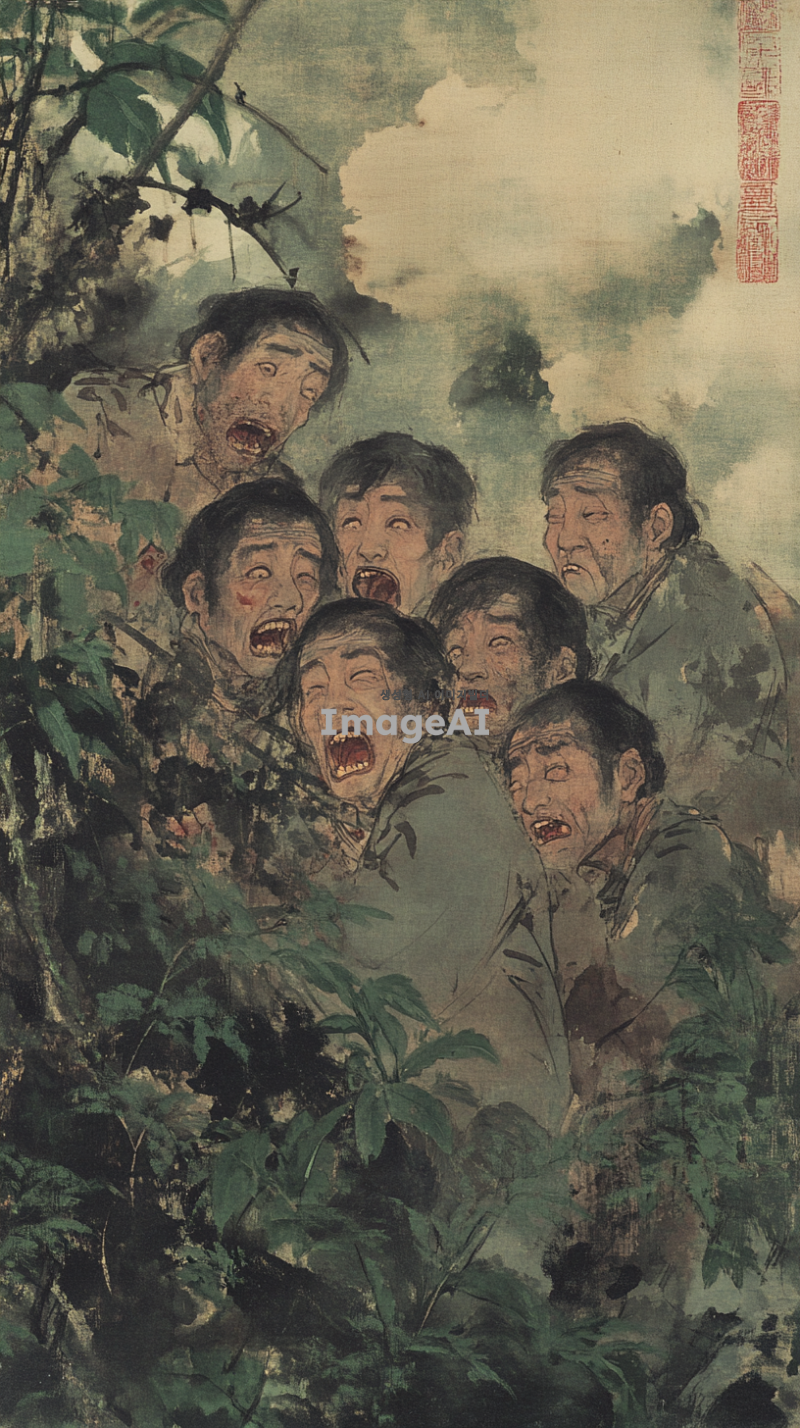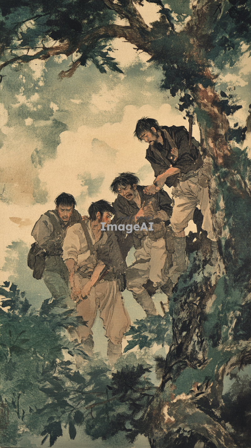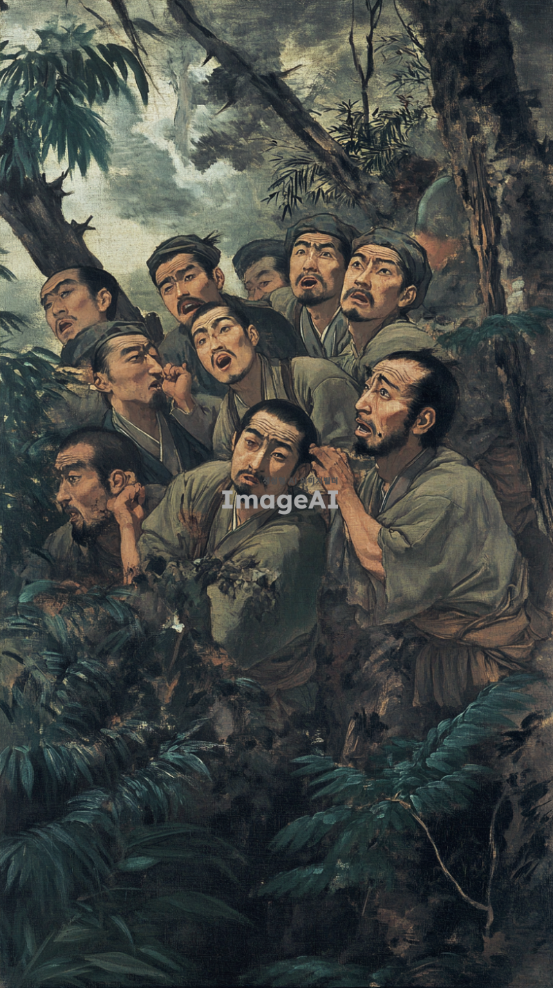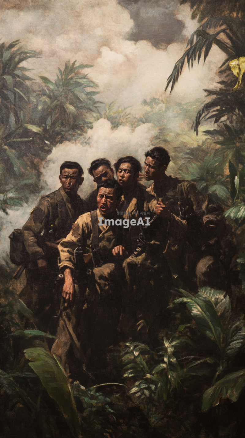 1844년 일본군 병사들이 울창한 정글 속에서 극심한 굶주림과 피로에 시달리는 모습. 병사들은 낡고 찢어진 군복을 입고 있으며, 얼굴에는 지친 표정과 수척한 모습이 드러나 있다. 주변은 짙은 녹음의 정글로 둘러싸여 있으며, 병사들은 서로를 부축하거나 나무에 기대어 있다. 배경은 흐린 하늘과 무성한 식물들로 가득 차 있으며, 병사들의 모습은 고통스럽고 절박한 상황을 잘 나타내고 있다.