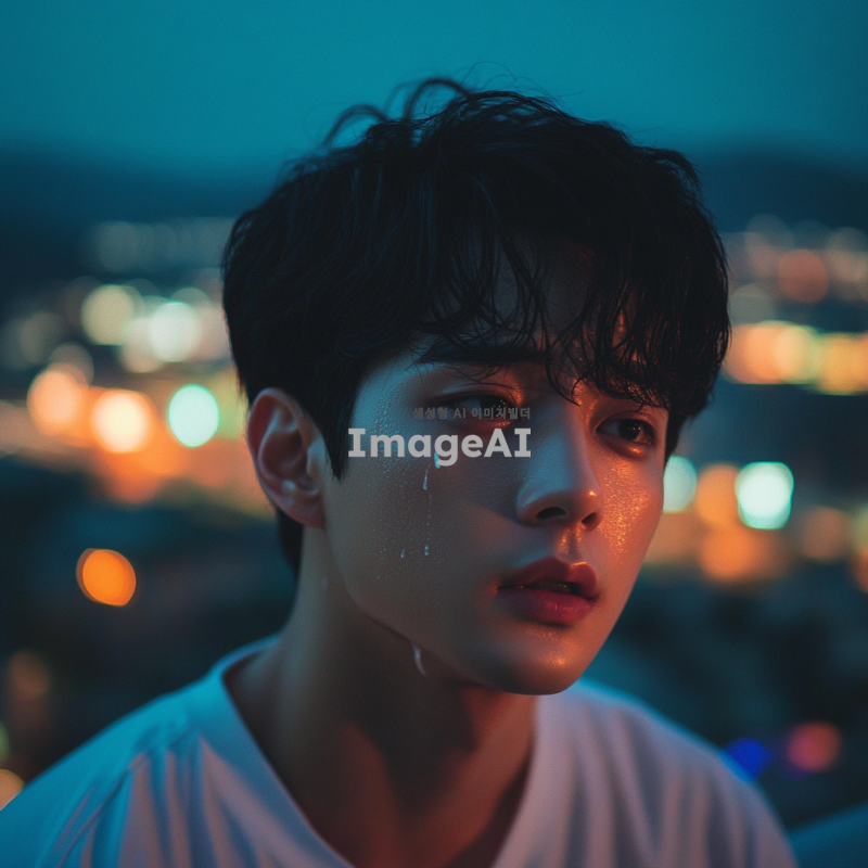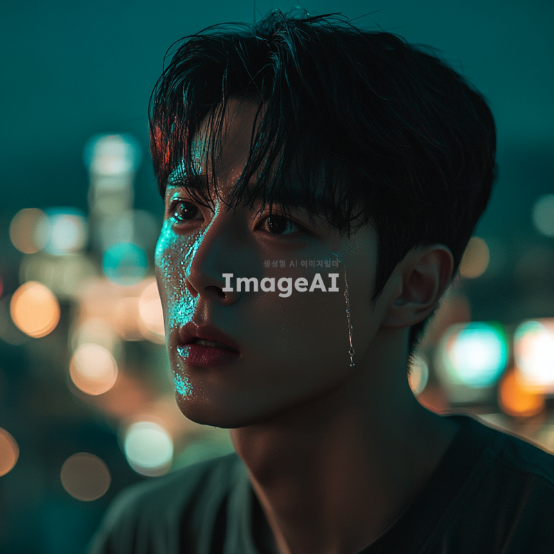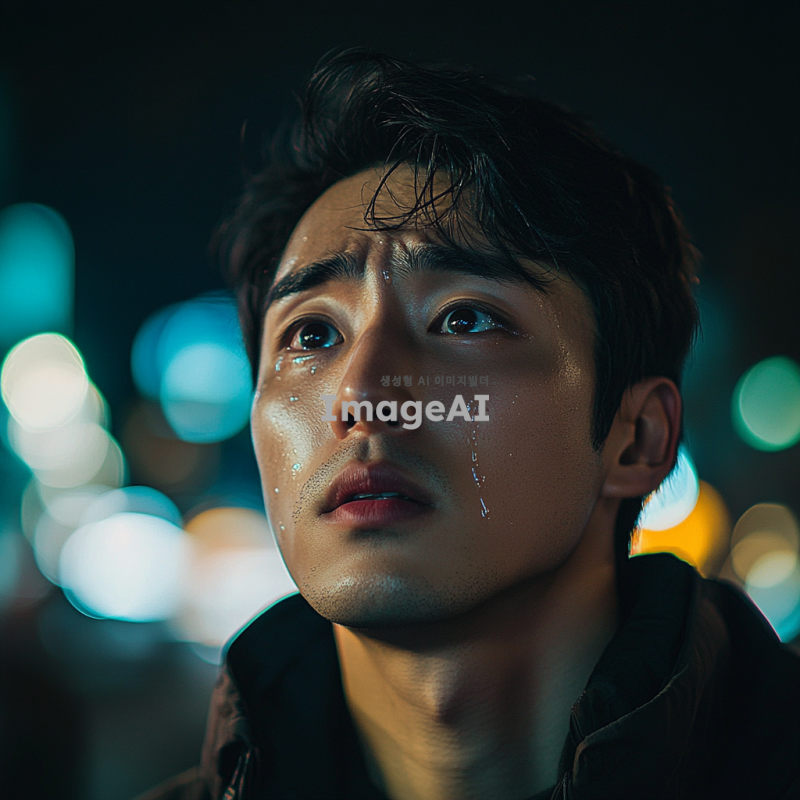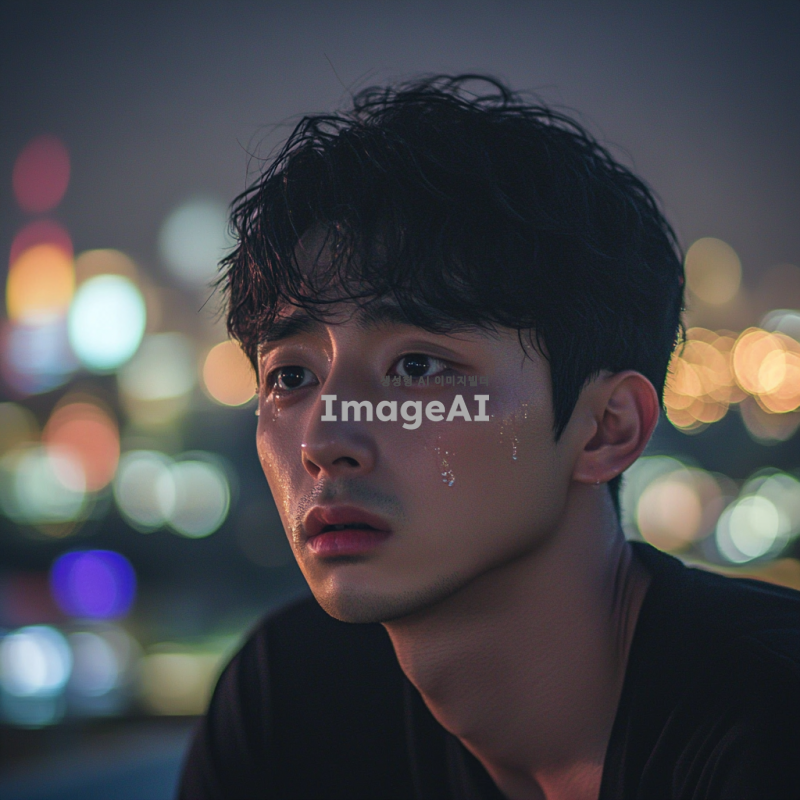 한국 남성, 아름다운 외모, 감정이 담긴 눈빛, 눈물 한 방울이 뺨을 타고 흐르는 모습, 부드러운 조명, 배경은 흐릿한 도시 야경, 감성적이고 서정적인 분위기.