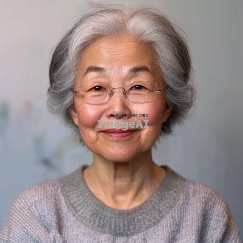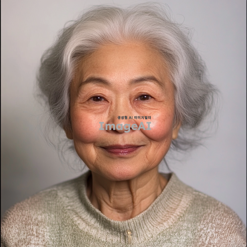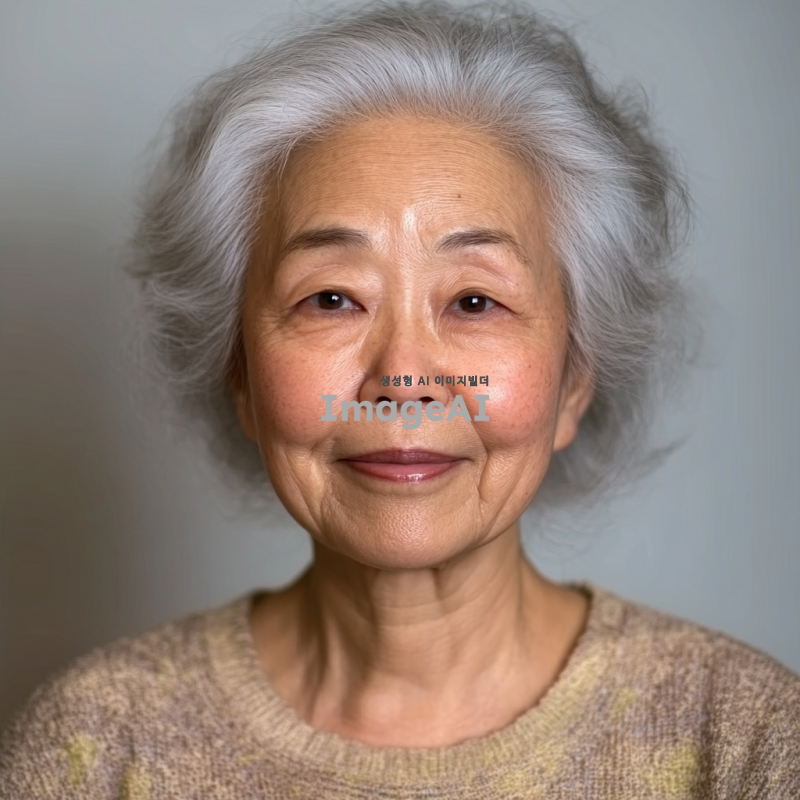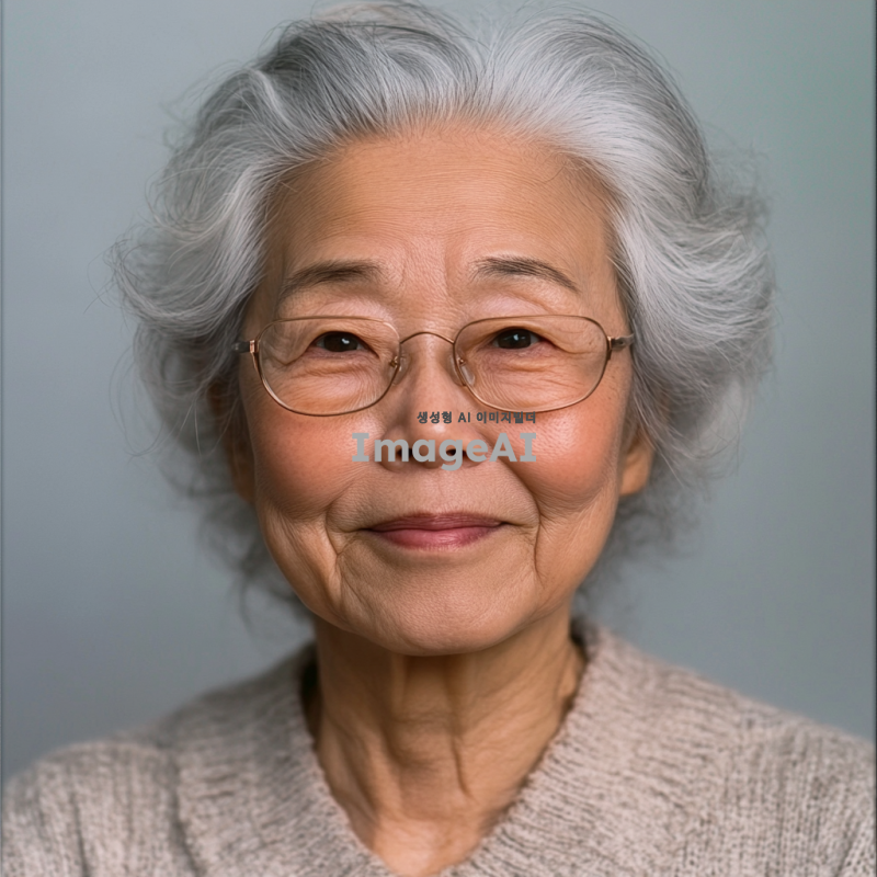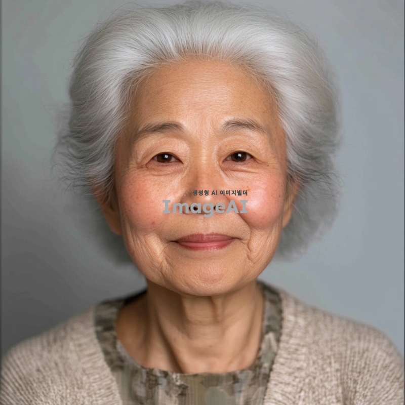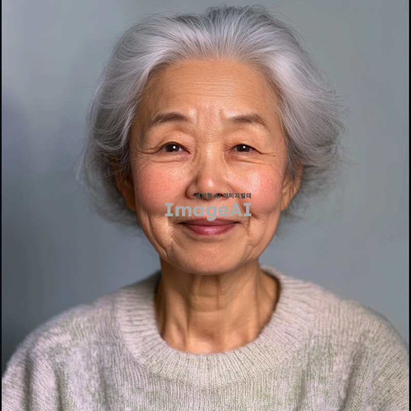 백발의 한국인 할머니, 증명사진 스타일, 눈가와 광대에 주름이 있으며 인자한 미소를 짓고 있음, 부드러운 조명, 중립적인 배경, 따뜻하고 친근한 분위기.