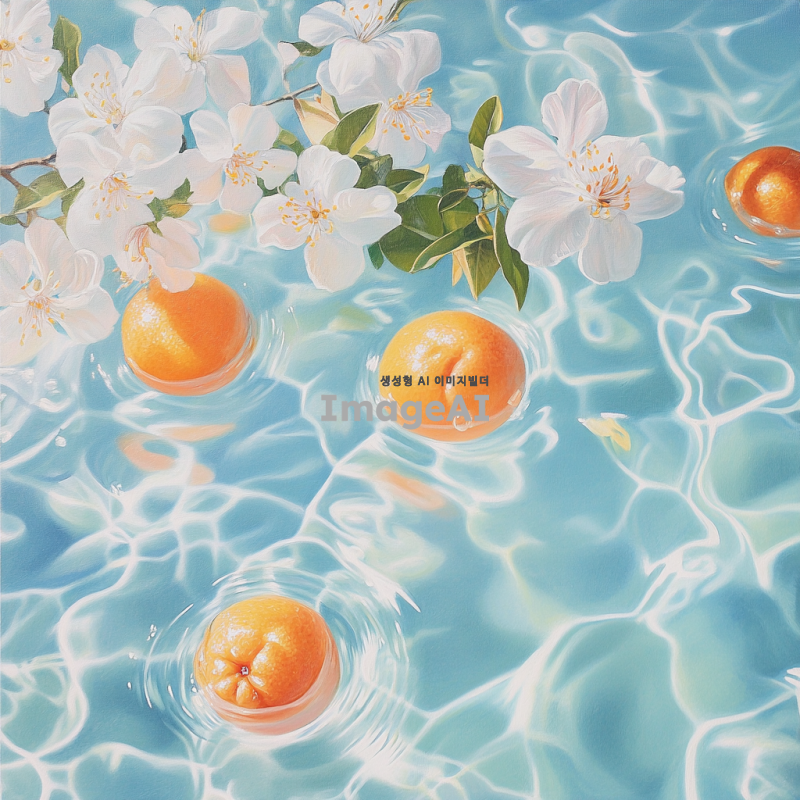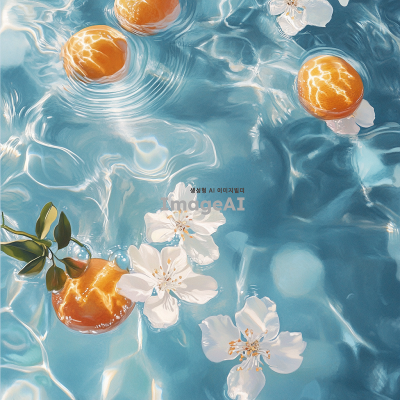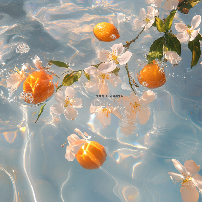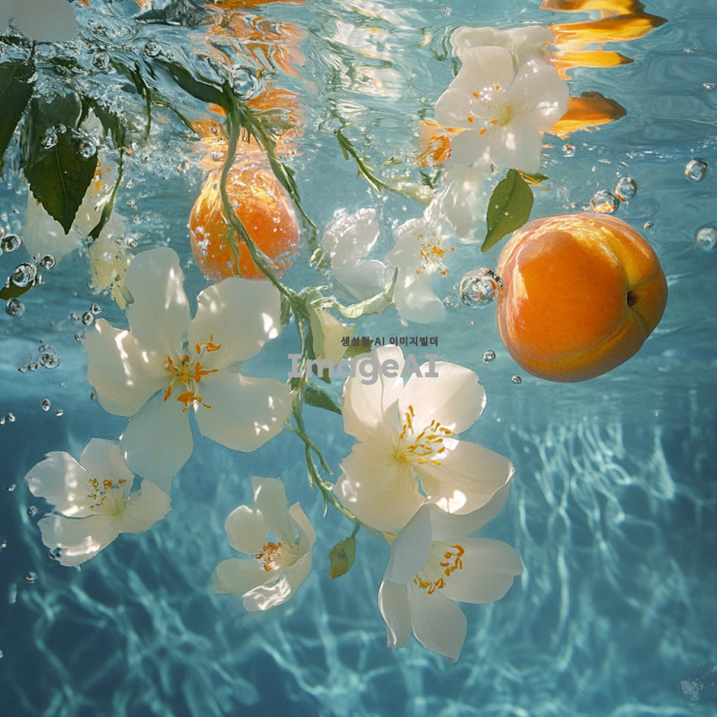 맑고 푸른 물속에서 자스민, 오렌지, 복숭아가 부드럽게 떠다니는 장면. 자스민 꽃은 은은한 흰색과 노란색으로 표현되고, 오렌지는 밝고 생생한 주황색으로, 복숭아는 부드러운 분홍색과 주황색이 조화롭게 어우러져 있는 모습. 물속에서 햇빛이 반사되어 반짝이는 효과를 주어 신비롭고 평화로운 분위기를 강조.