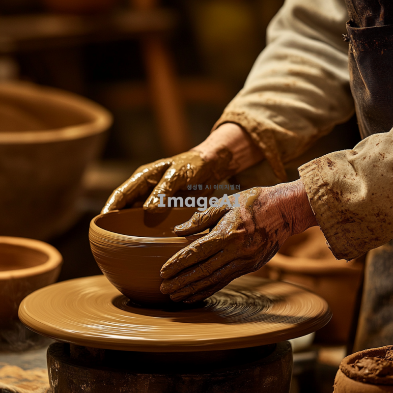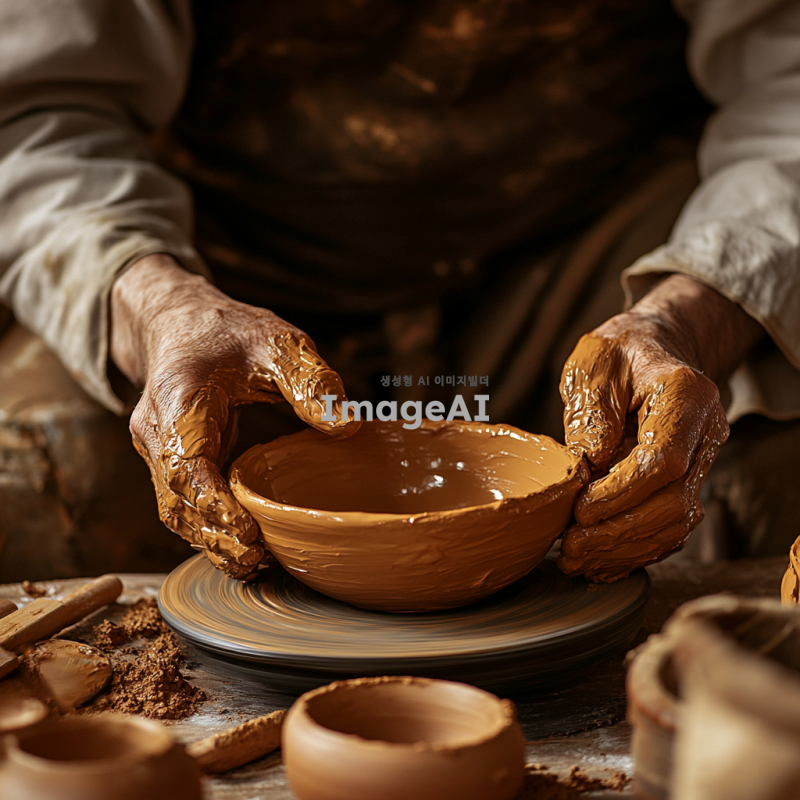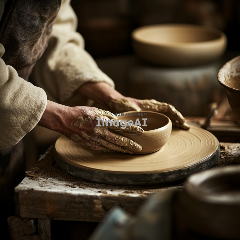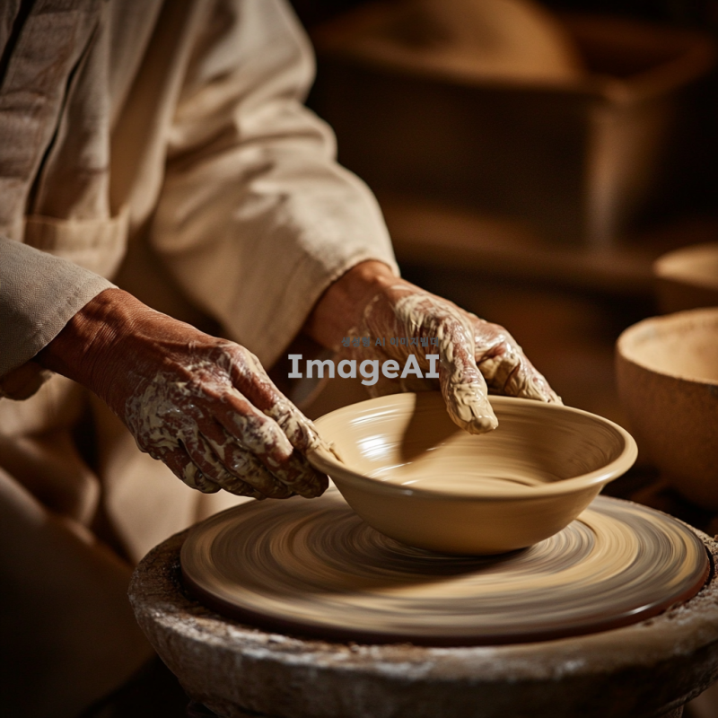 전통적인 한국 도예가가 물레를 사용하여 그릇을 만드는 장면, 작업실 내부는 흙과 도구들이 정리되어 있으며, 도예가의 손에 묻은 흙과 정성스럽게 빚어지는 그릇의 형태가 강조된 모습, 따뜻한 조명이 작업 공간을 부드럽게 비추고 있는 분위기.