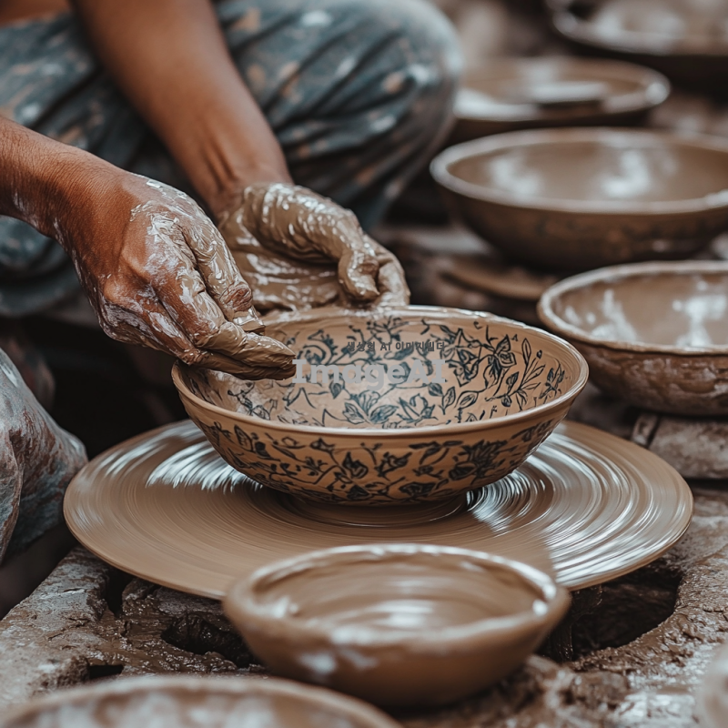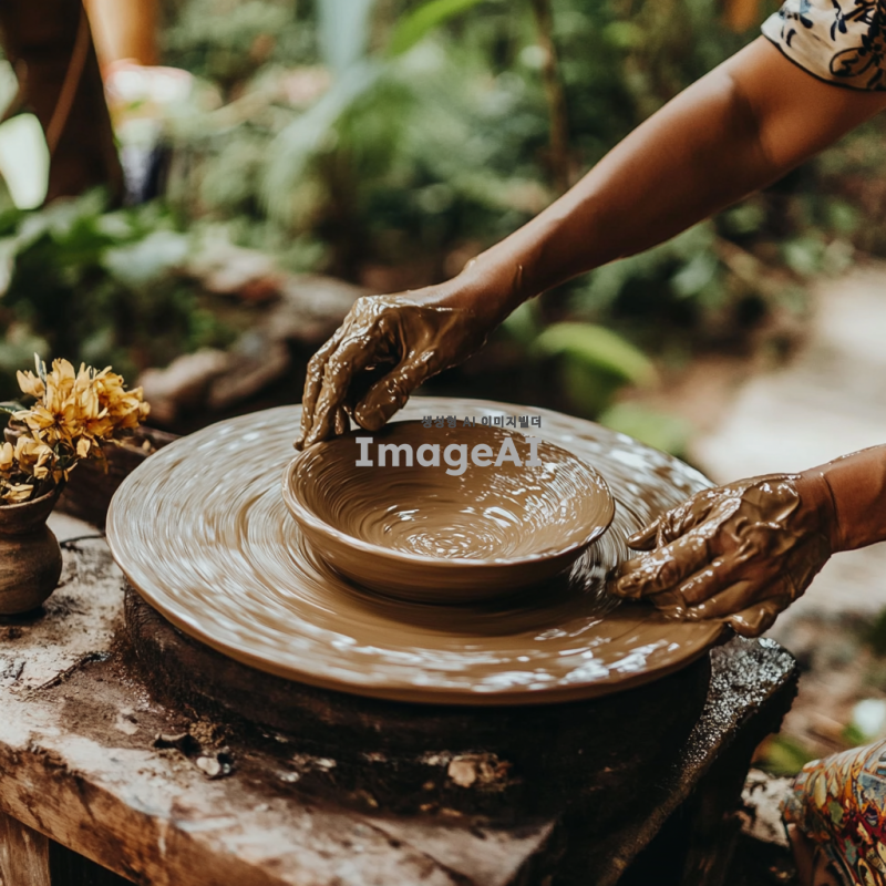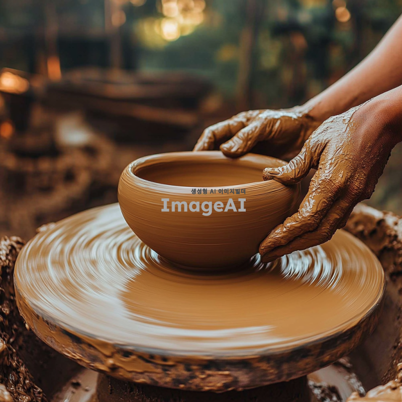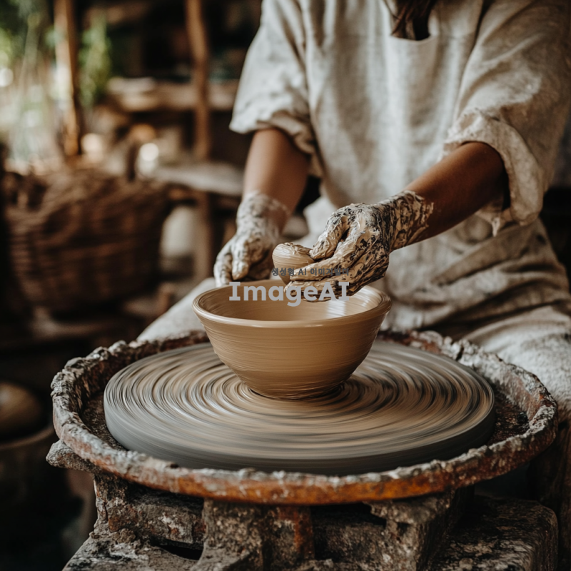 - 한 사람이 도자기 물레에서 손으로 점토를 형태로 만들어 복잡한 세부 사항과 질감을 가진 그릇을 만들고 있습니다. 이 장면은 원재료를 사용하여 아름다운 도자기 물건을 만드는 도예 예술을 포착하는 그림으로 해주고