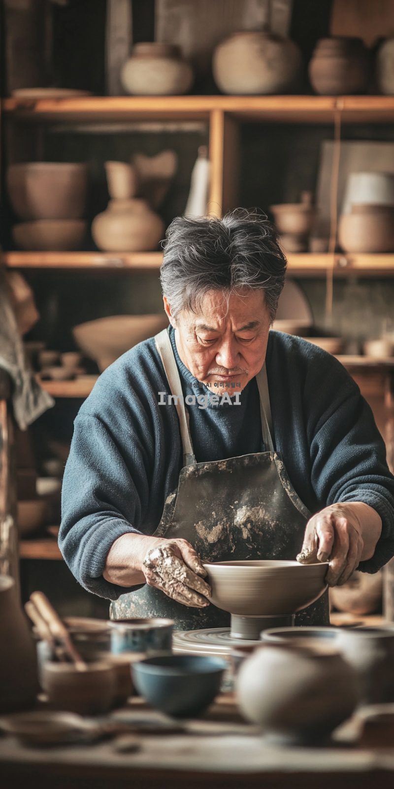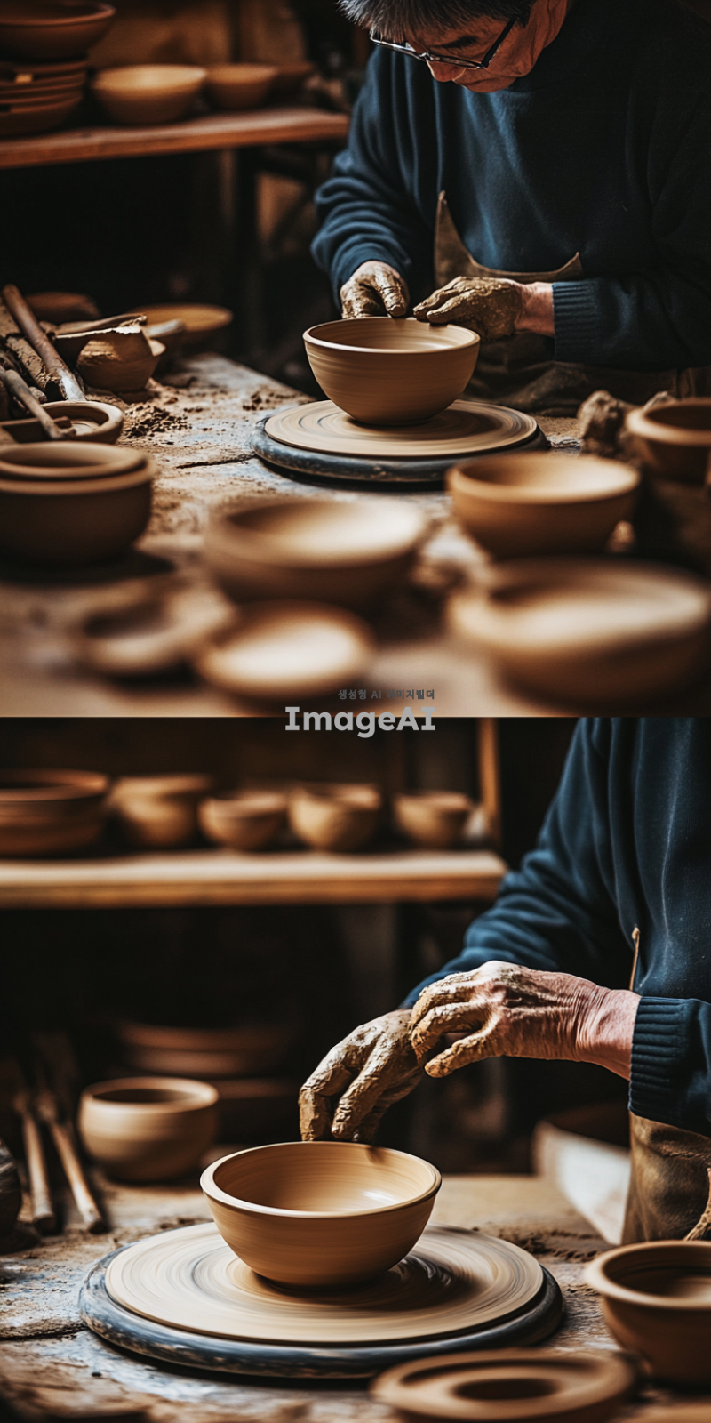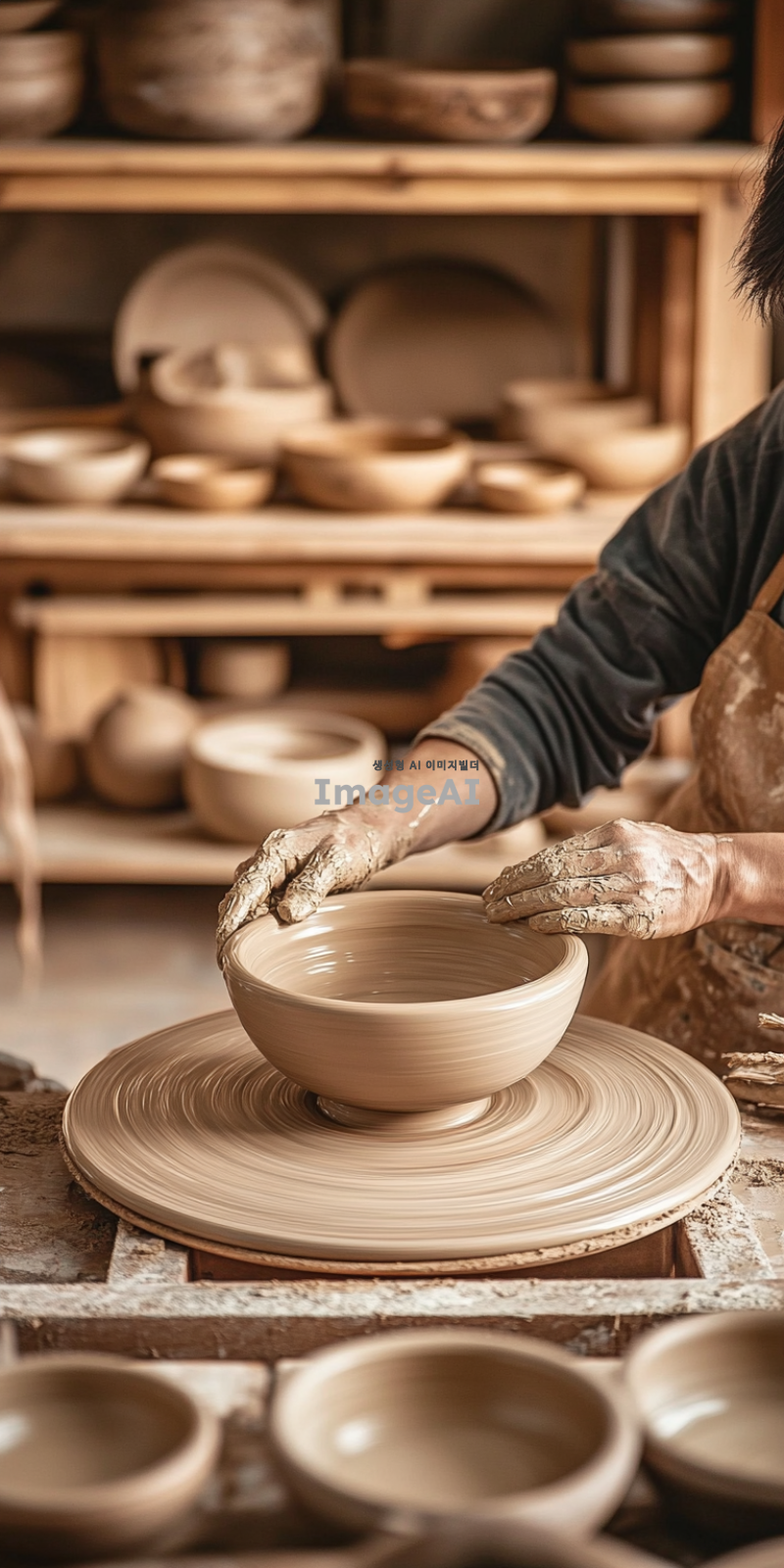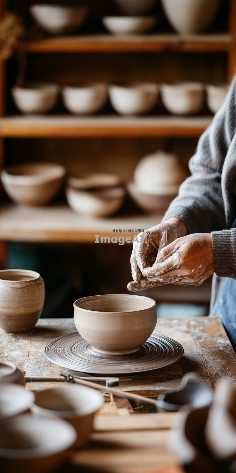 전통적인 한국 도예가가 물레를 사용하여 그릇을 만드는 장면, 작업장은 자연광이 부드럽게 들어오는 따뜻한 분위기, 도예가의 손은 섬세하게 그릇의 형태를 잡고 있으며, 주변에는 다양한 도구와 도자기 재료들이 정돈되어 있음, 작업 중인 도예가의 집중된 표정과 손의 움직임을 강조, 배경에는 완성된 도자기들이 선반에 진열되어 있는 모습, 전통과 현대가 조화된 작업 공간, 색감은 자연스러운 흙색과 따뜻한 톤으로 구성.