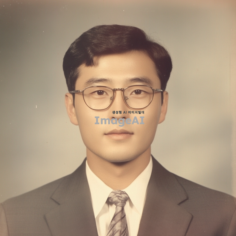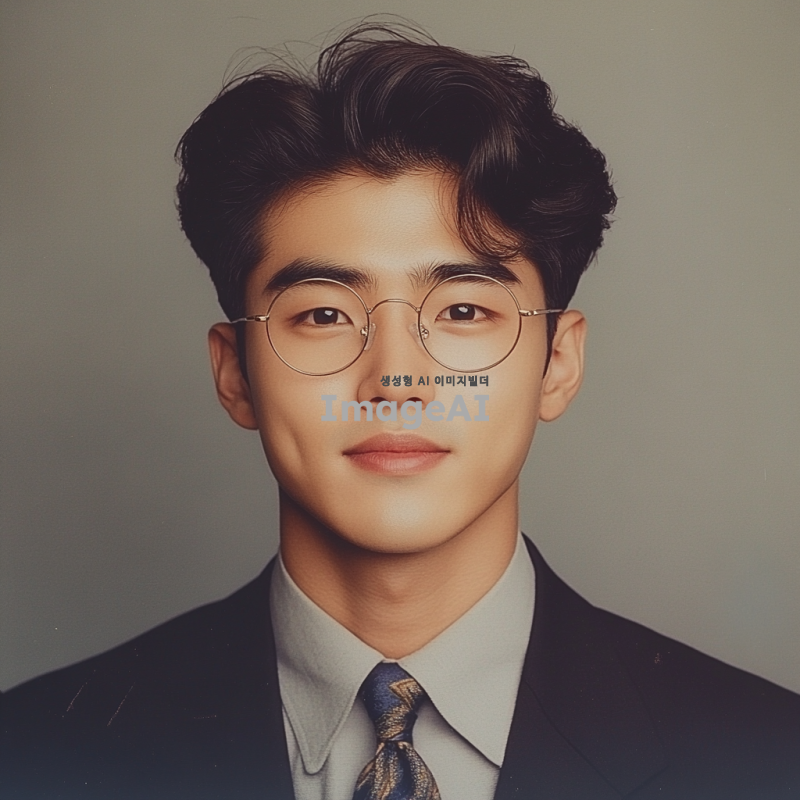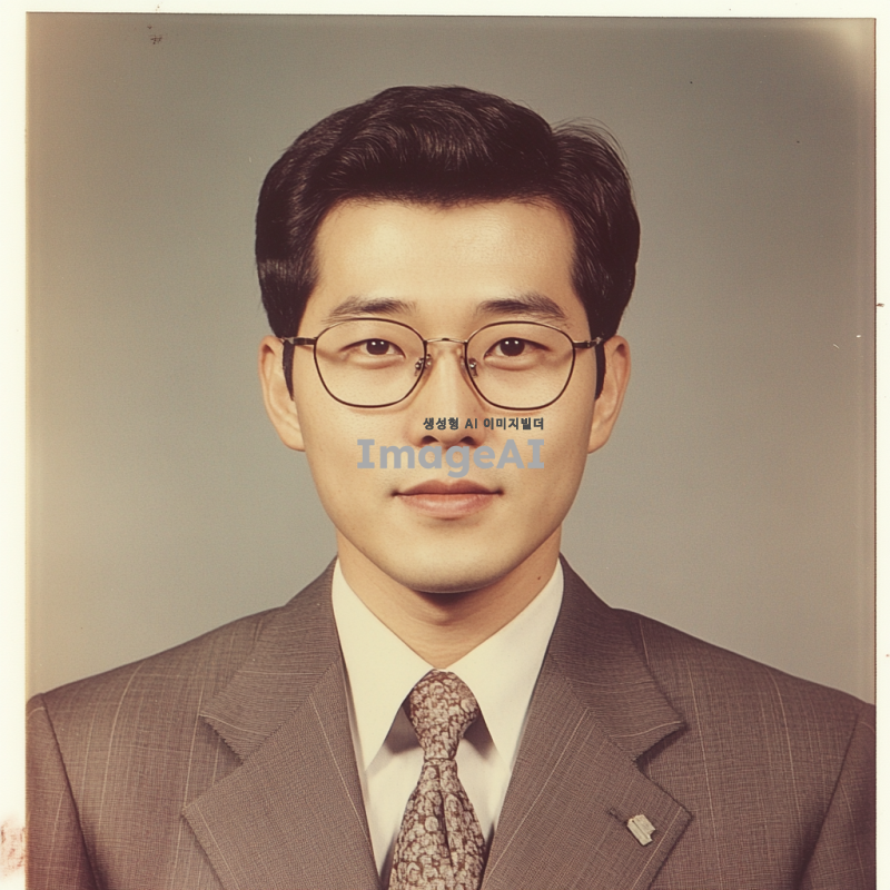 30대 초중반 한국인 남성, 안경 착용, 정장을 입고 있으며, 머리는 깔끔하게 정돈되어 있다. 신뢰는 주는 미소, 증명사진, 상반신까지 나와야함