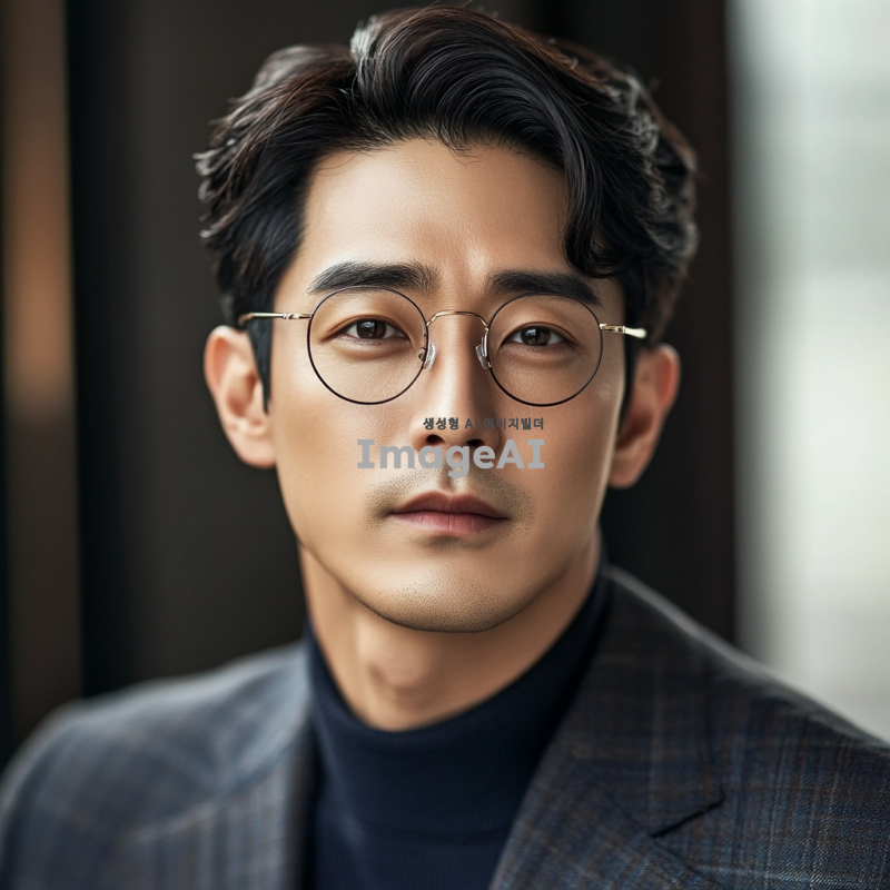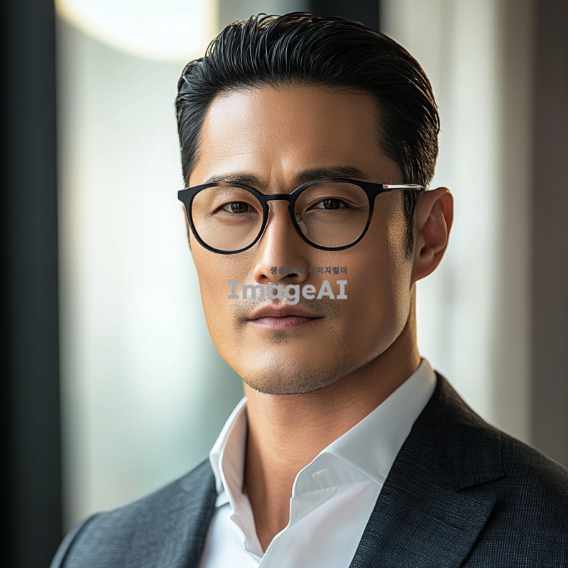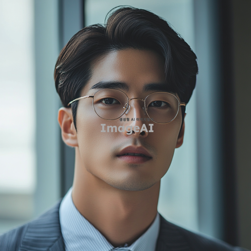30대 초중반 한국인 남성 안경을 쓰고있고, 스마트 캐주얼 정장을 입고 있으며, 머리는 요즘 세대에 맞는 가르마 스타일. 조명은 자연광이 들어오는 밝은 분위기, 증명사진,