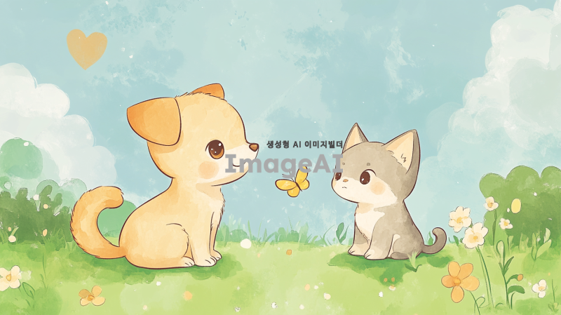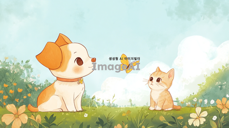 밝고 사랑스러운 분위기의 일러스트, 푸른 하늘 아래 푸른 들판에서 귀여운 강아지와 고양이가 나란히 앉아 있는 모습, 강아지는 작은 노란색 나비를 쫓고 있고, 고양이는 작은 꽃을 바라보고 있는 장면, 전체적으로 따뜻하고 포근한 색감, 부드러운 그림체, 한국적인 느낌을 살린 전통 문양이 살짝 가미된 배경.