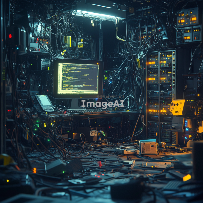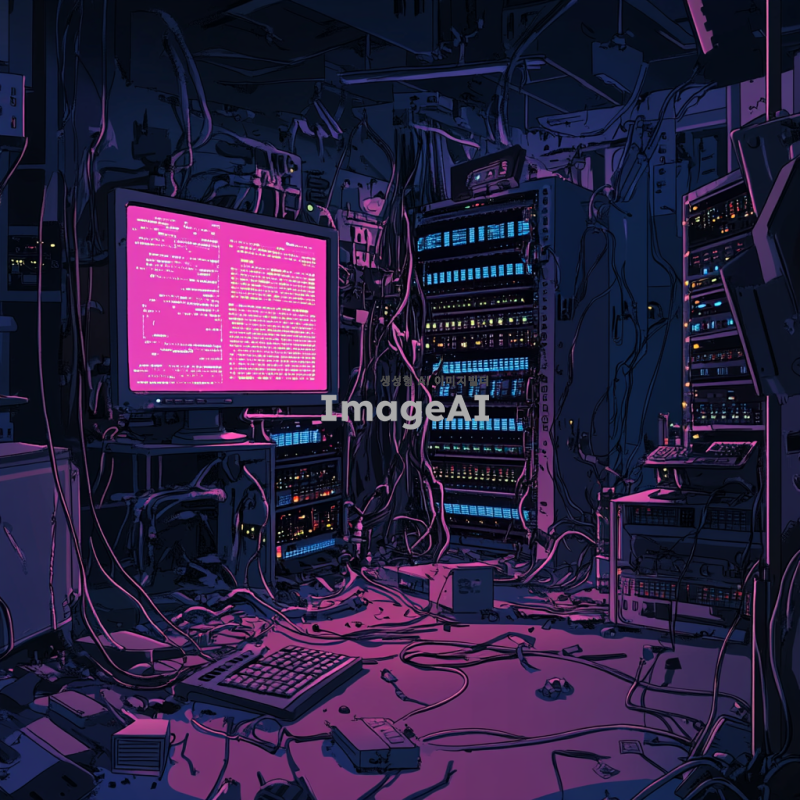 고장난 디스코드 서버의 내부 모습, 전자기기와 케이블이 엉켜 있는 복잡한 장면, 서버 랙이 기울어져 있고 불빛이 깜빡이는 모습, 고장난 모니터에 에러 메시지가 표시되어 있는 상황, 전체적으로 어수선하고 혼란스러운 분위기, 어두운 조명 아래에서 기술적 문제를 해결하려는 모습.