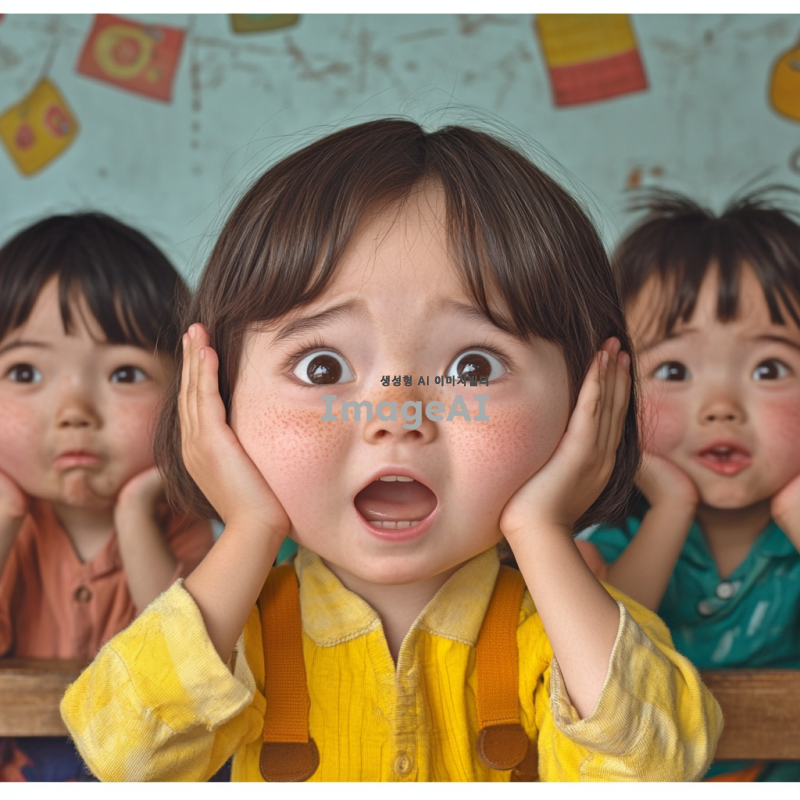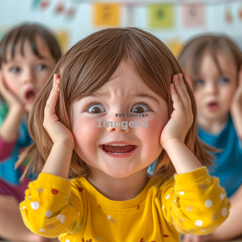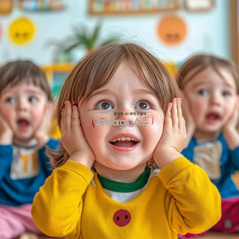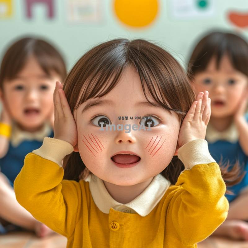 유치원 교실 안에서 여러 명의 유치원생들이 앉아 있는 모습, 아이들은 모두 귀를 막고 있으며, 얼굴에는 인상을 찌푸린 채 괴로워하는 표정이 드러나 있다. 아이들은 다양한 표정과 자세로 귀를 막고 있으며, 각자 다른 색상의 유치원 복장을 입고 있다.