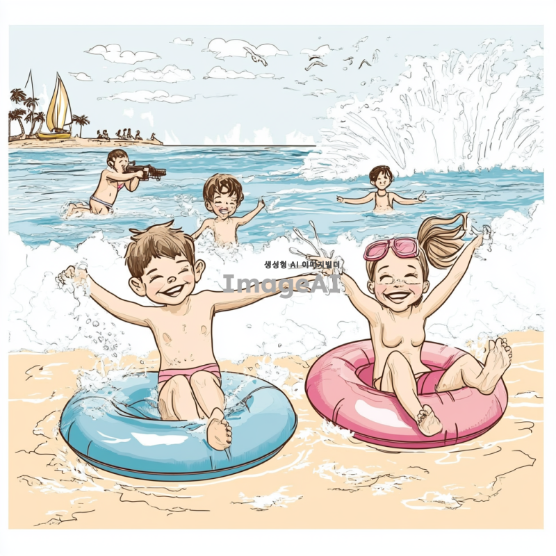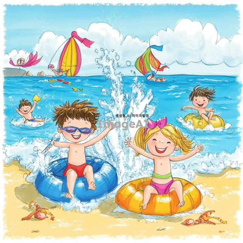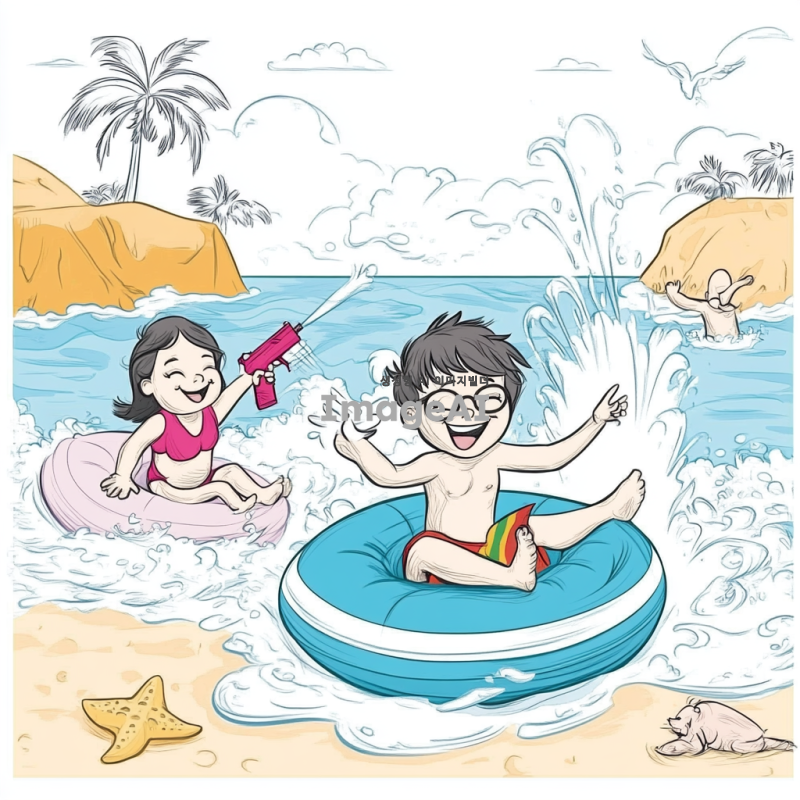 물놀이하는 어린이들의 장면, 해변가에서 튜브를 타고 있는 아이들, 물총으로 서로 물을 뿌리는 모습, 웃고 있는 얼굴들, 간단한 선으로 표현된 바다와 모래, 밝고 명랑한 분위기, 색칠하기 쉽게 선명한 외곽선, 복잡하지 않은 배경.