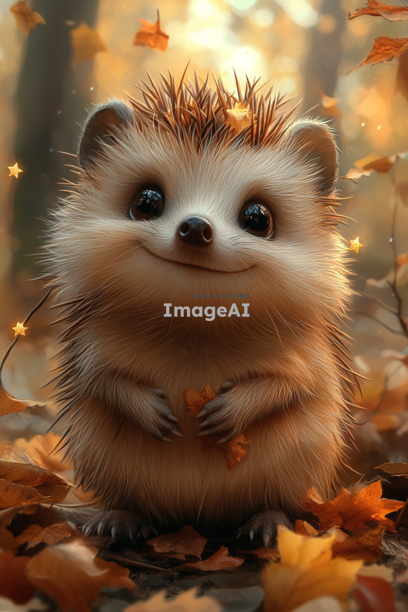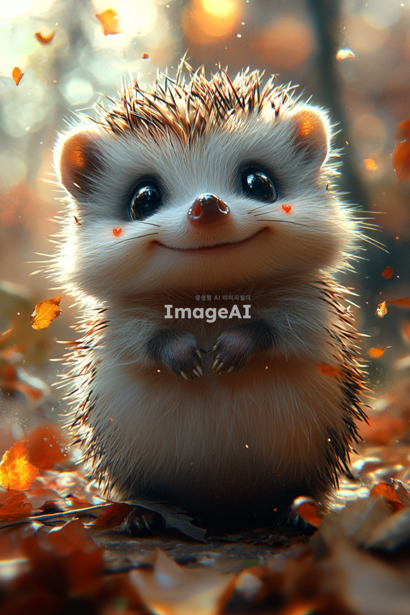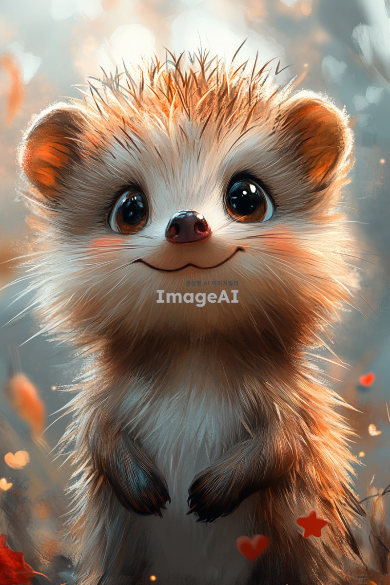 따뜻하고 친근한 느낌의 고슴도치 캐릭터, 귀엽고 부드러운 털을 가진 모습, 큰 눈과 웃고 있는 표정, 캐릭터의 몸 주위에 작은 별이나 하트 같은 장식 요소들, 청소년들과 함께 모험을 떠날 준비가 된 활기찬 포즈, 캐릭터의 진화에 따라 점점 더 화려하고 다양한 색상의 털과 장식들이 추가되는 모습, 다양한 활동에 참여하며 점차 성장하는 모습이 잘 드러나도록 디자인.