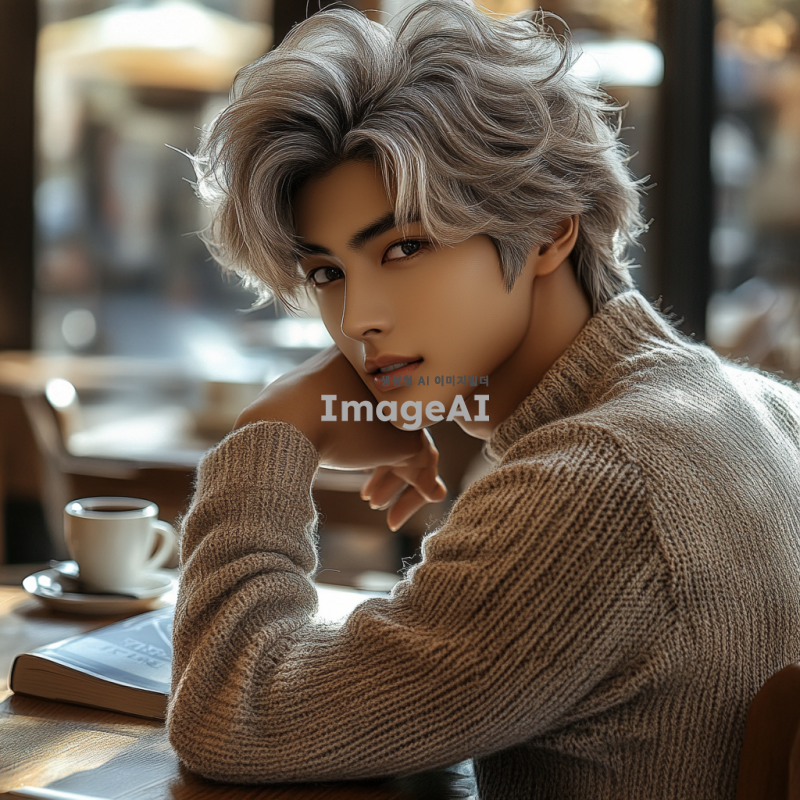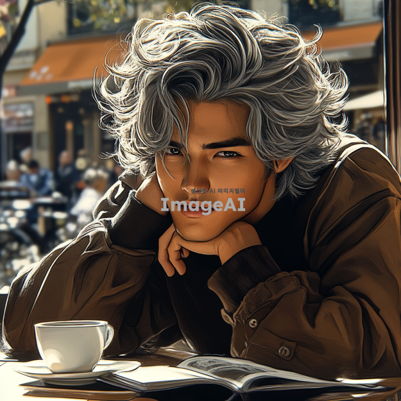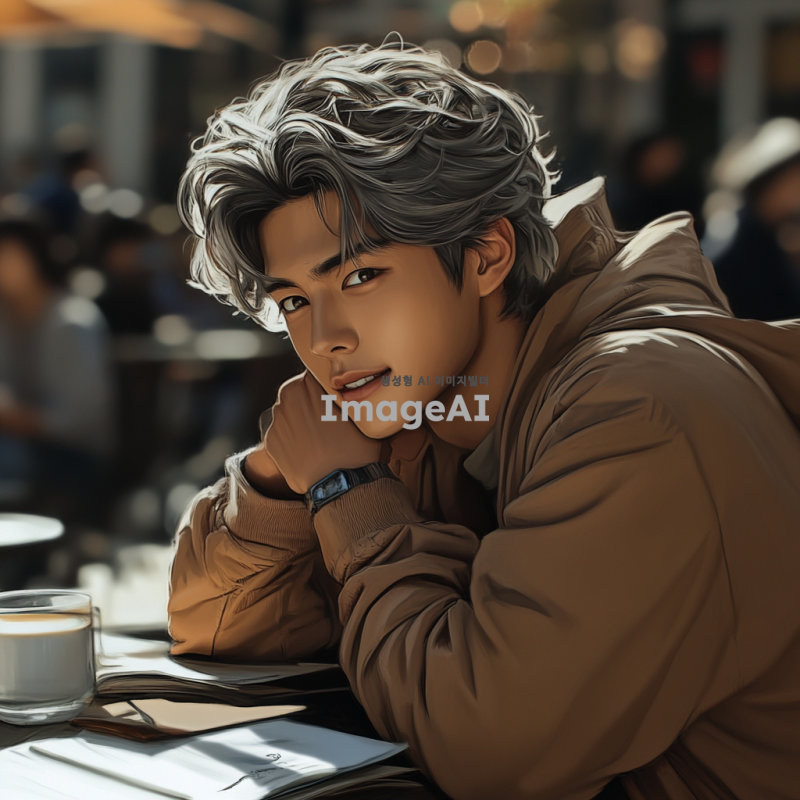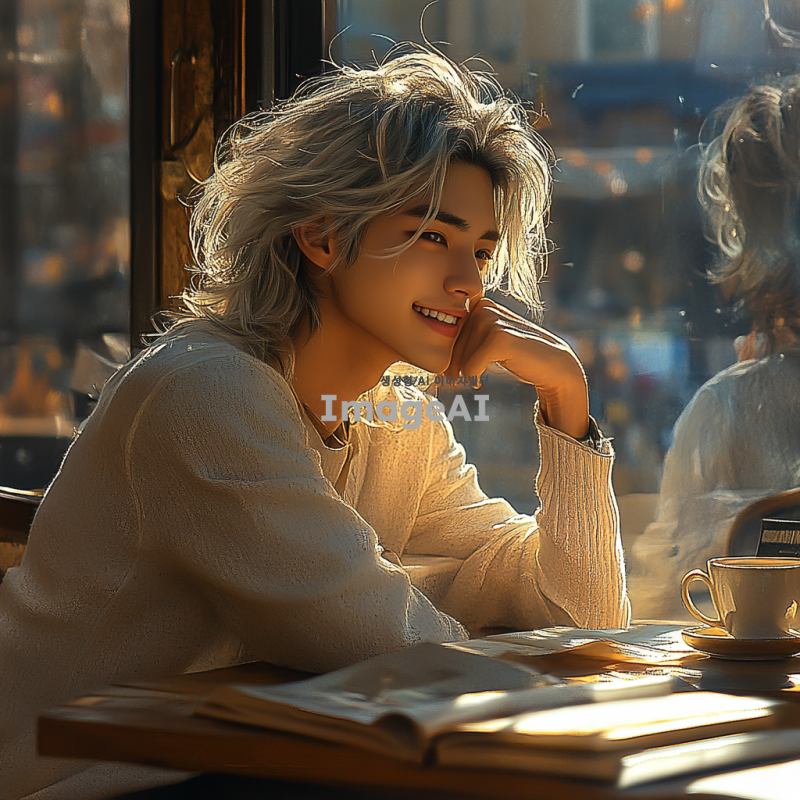 햇살이 부드럽게 비치는 카페 내부, 회색 머리카락과 회색 눈동자를 가진 17세 한국인 남자 캐릭터가 테이블에 앉아 턱을 괴고 미소 짓고 있는 모습. 따뜻하고 편안한 분위기, 주변에 커피잔과 책이 놓여 있는 장면.