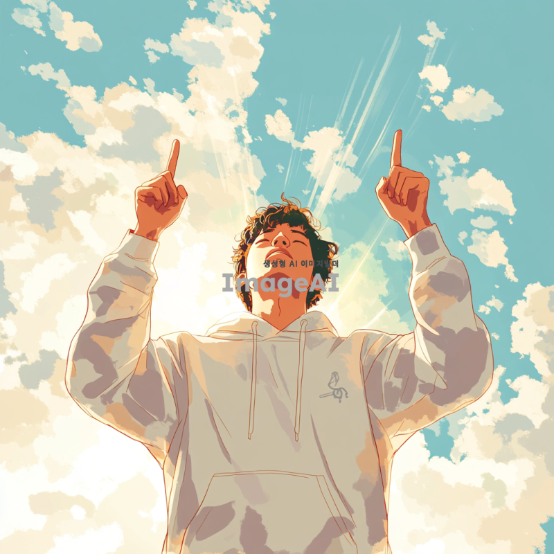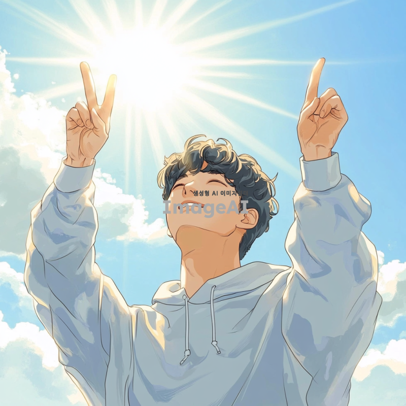 하늘을 배경으로 검지손가락 두 개를 위로 찌르는 동작을 하는 한국인, 밝고 활기찬 분위기, 손가락 끝에서 빛이 나는 효과, 맑은 하늘과 구름이 있는 배경, 캐주얼한 옷차림, 자연스러운 포즈와 표정, 일러스트 스타일