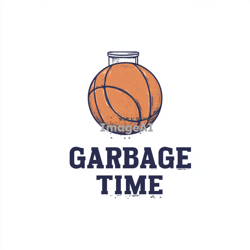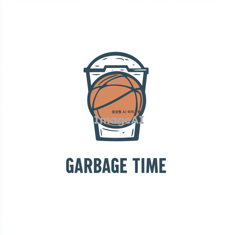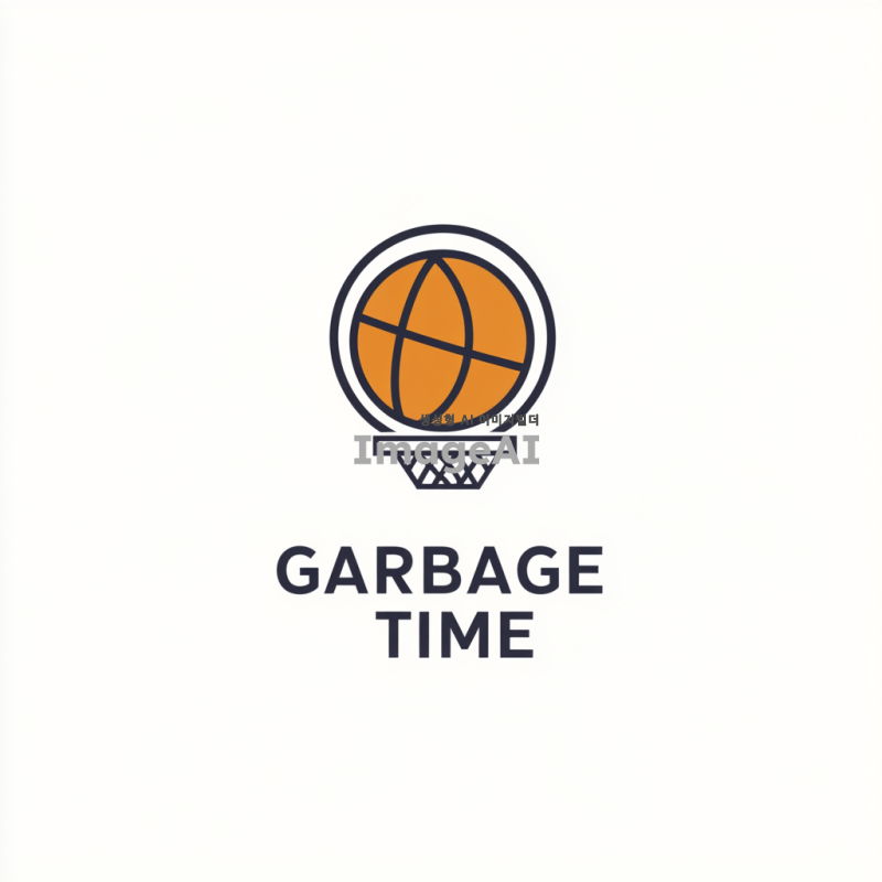 농구공과 휴지통 뚜껑을 결합한 창의적인 아이콘 디자인. 농구공은 중앙에 위치하며, 그 위에 휴지통 뚜껑이 농구 골대처럼 올려져 있는 모습. 아이콘 아래에는 "GARBAGE TIME"이라는 팀 이름이 간결하고 현대적인 서체로 적혀 있음. 배경은 심플한 흰색으로 두어 아이콘과 텍스트가 돋보이도록 구성.