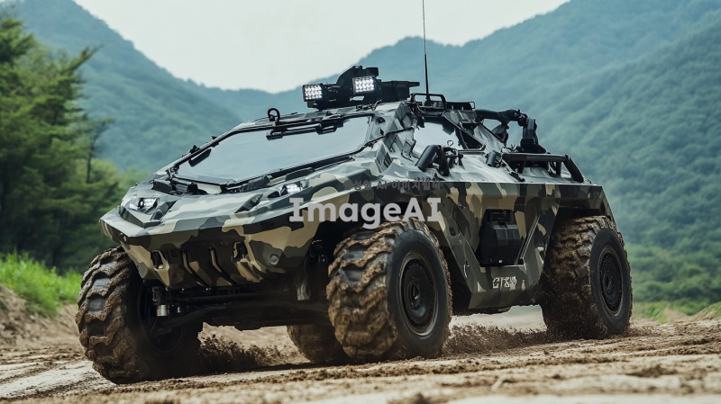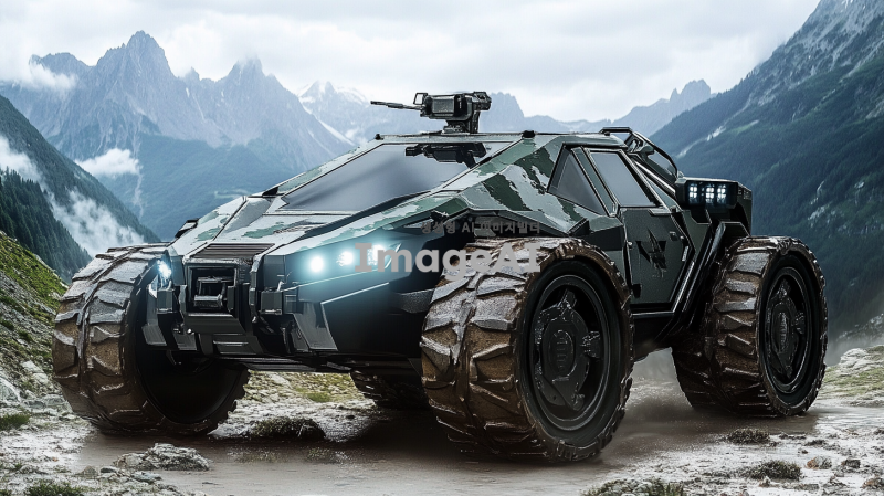 미래적인 디자인의 3식 반궤도차량, 군용으로 사용되는 강력한 외관, 매끄러운 곡선과 각진 형태가 조화를 이루는 모습, 견고한 금속 재질과 세부적인 기계 부품이 드러나는 디테일, 한국의 산악 지형을 배경으로 한 역동적인 주행 장면, 차량의 앞쪽에 장착된 고성능 조명과 레이더 장비, 위장무늬가 적용된 차체, 주변 환경과 조화를 이루는 색상과 질감, 첨단 기술이 적용된 현대적인 느낌.