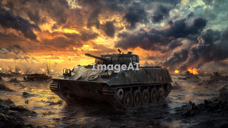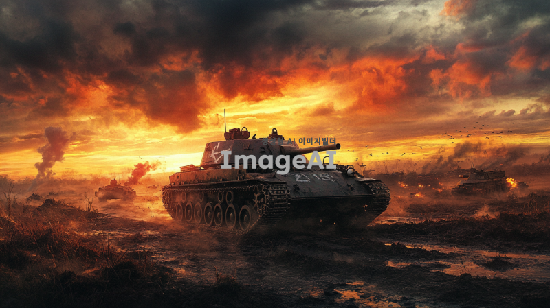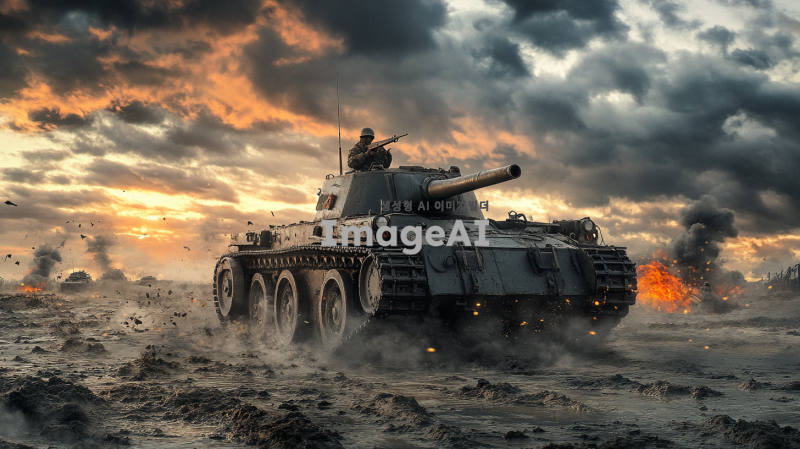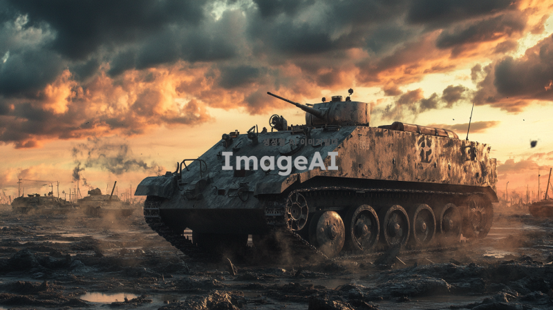 2차 세계대전 당시의 일본 반궤도차량 1식 호하가 전쟁터에서 진격하는 장면, 전차 주변에는 전투의 긴장감이 감도는 전장 배경, 하늘에는 구름이 드리워져 있어 어두운 분위기를 연출하며, 전차의 세부적인 구조와 전쟁의 흔적이 잘 드러나도록 표현.