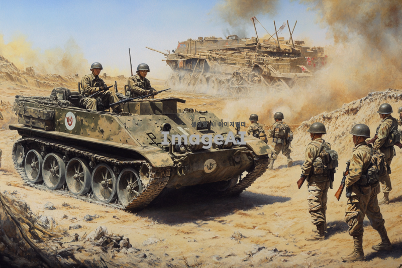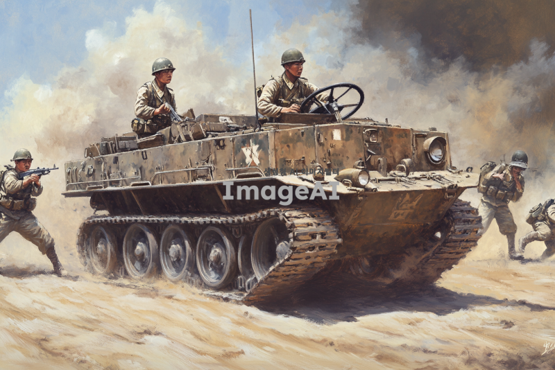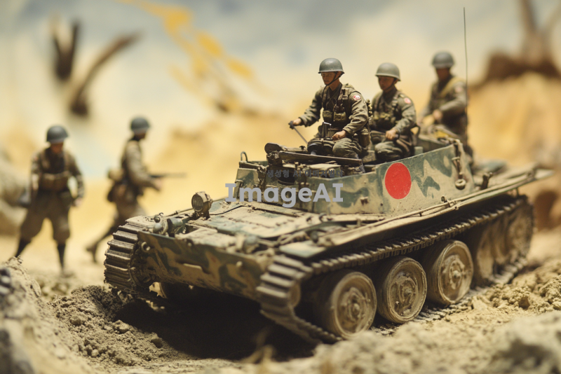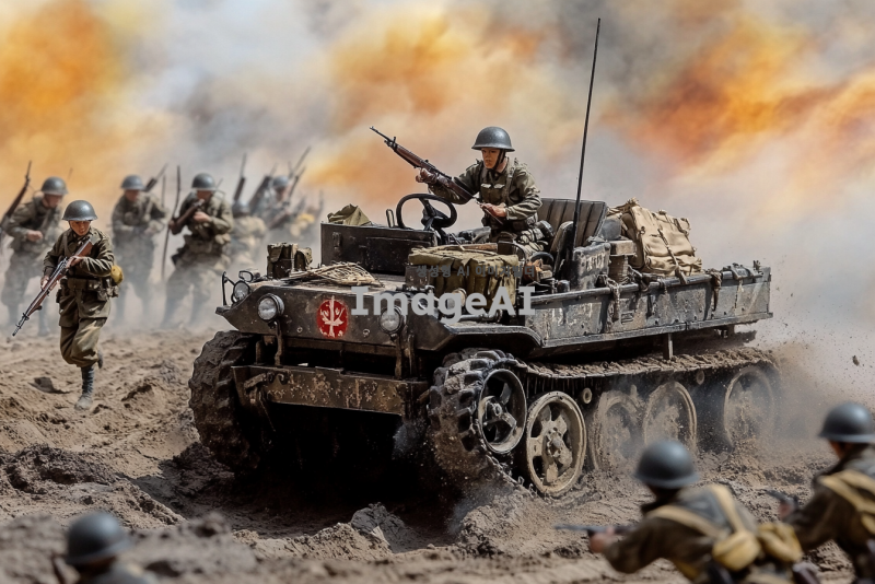 2차 세계대전 당시의 일본 제국 육군의 반궤도차량 1식 호하, 전장에서 사용 중인 모습, 군인들이 주변에 배치되어 있으며, 전통적인 군복과 헬멧을 착용하고 있음, 배경은 전쟁 중인 전장으로, 먼지가 날리는 황야와 군사 장비들이 배치되어 있는 모습, 차량의 세부적인 부분이 잘 드러나도록, 빛과 그림자가 사실적으로 표현됨, 전쟁의 긴장감과 역동성이 느껴지는 장면.