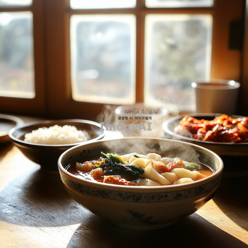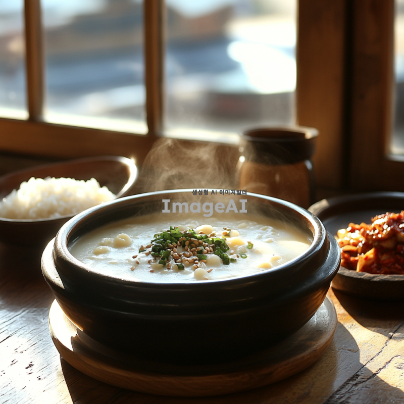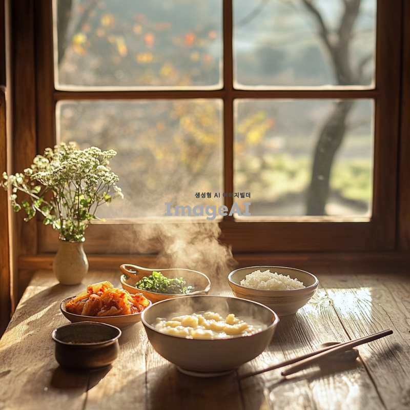 따뜻한 아침 햇살이 비치는 전통 한국 주방, 나무로 된 테이블 위에 신선한 콩 비지가 담긴 그릇, 옆에는 김치와 밥이 놓여 있으며, 정성스럽게 준비된 한국 가정식의 따뜻한 분위기, 그릇에서 김이 모락모락 피어오르는 모습, 자연스러운 색감과 조화로운 배치.
